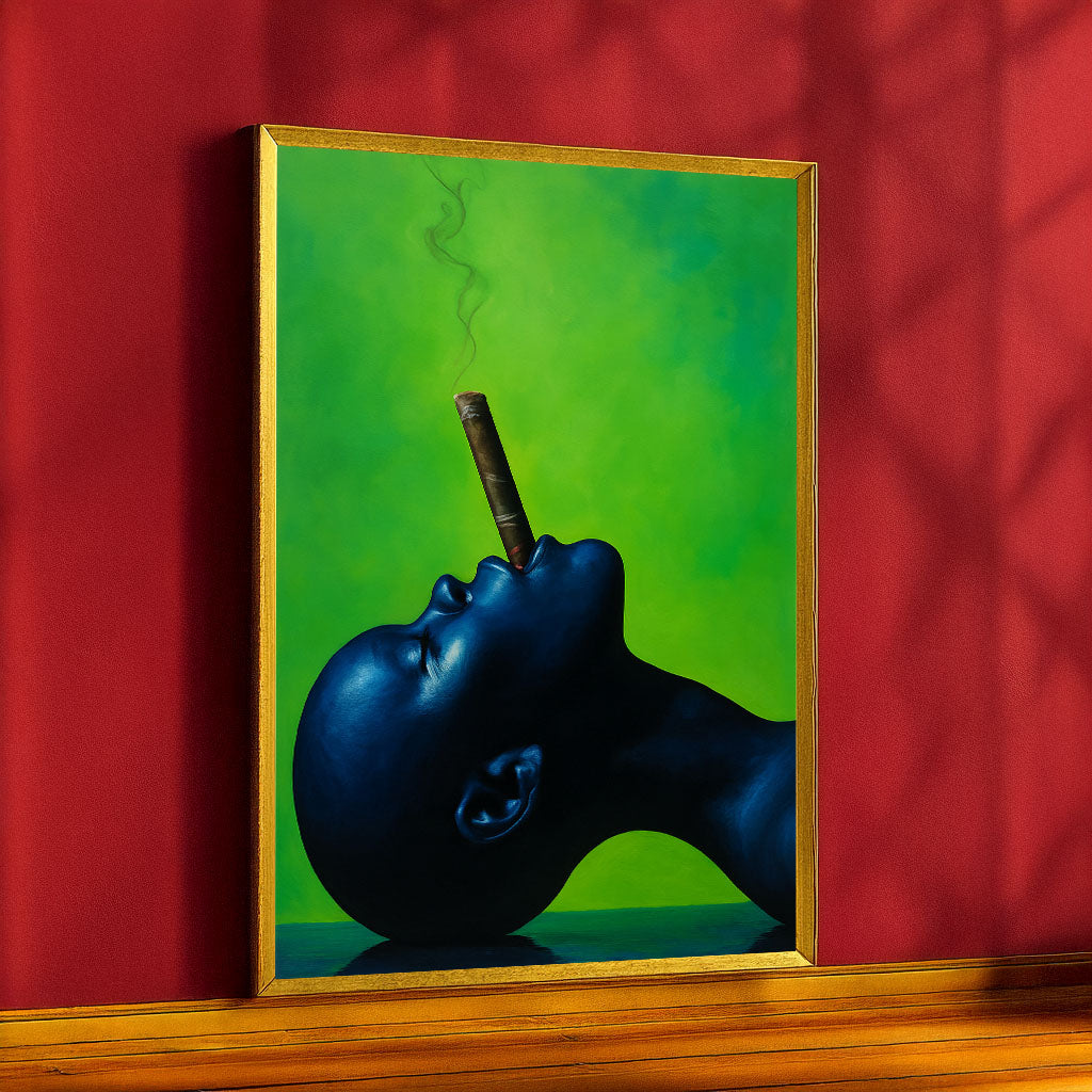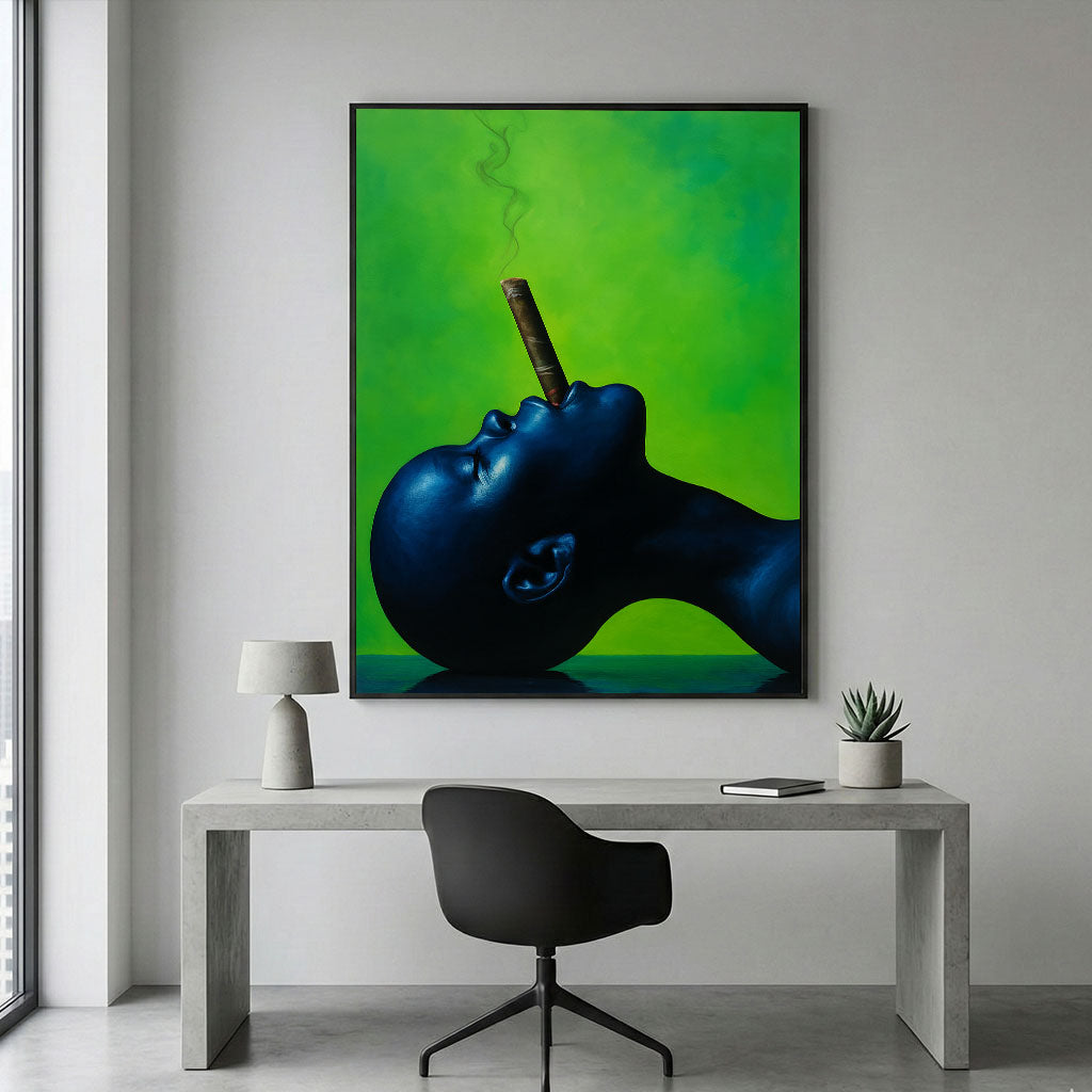 Bold Blue Woman With Cigar On Green Canvas Wall Art