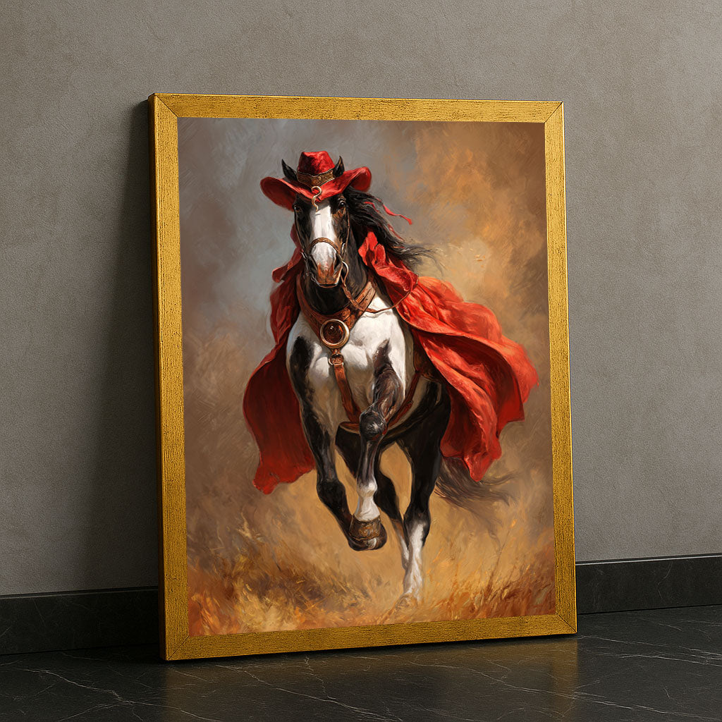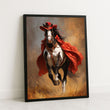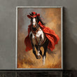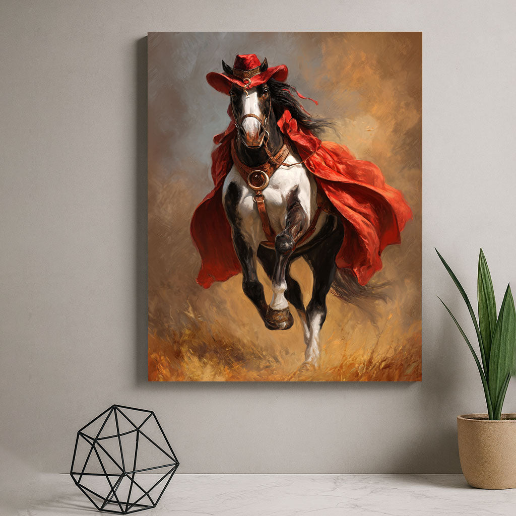 Dramatic Black And White Horse In Red Cape Canvas Wall Art