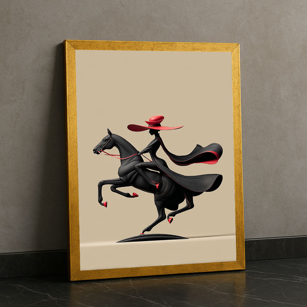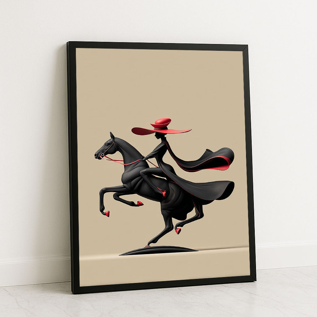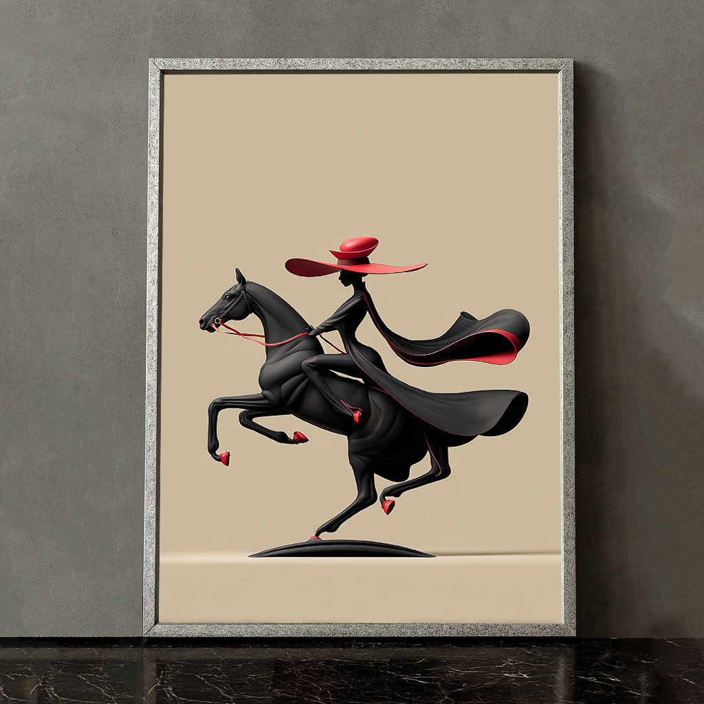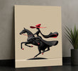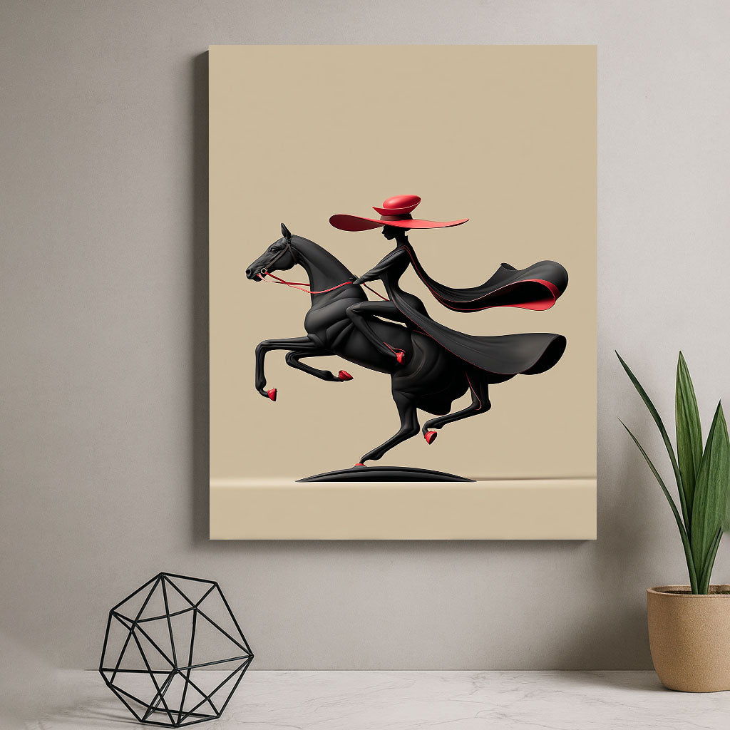 Dynamic Black Horse And Rider In Red Hat Canvas Wall Art