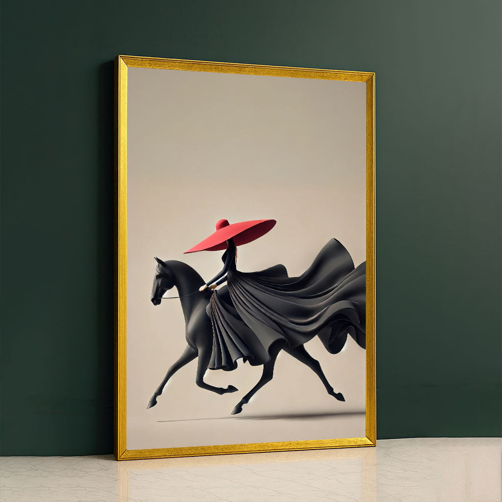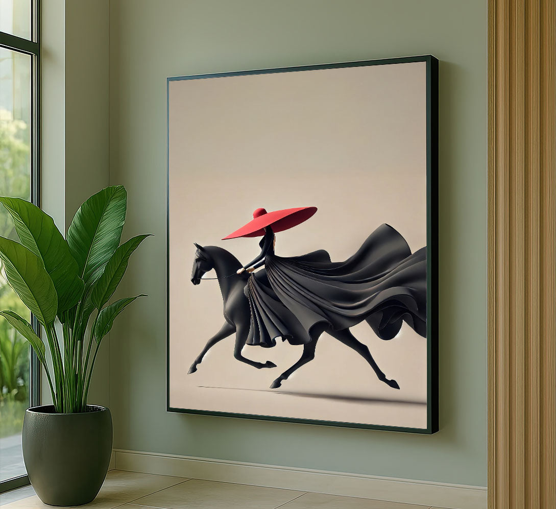 Elegant Woman In Flowing Black Dress On Horse Canvas Wall Art