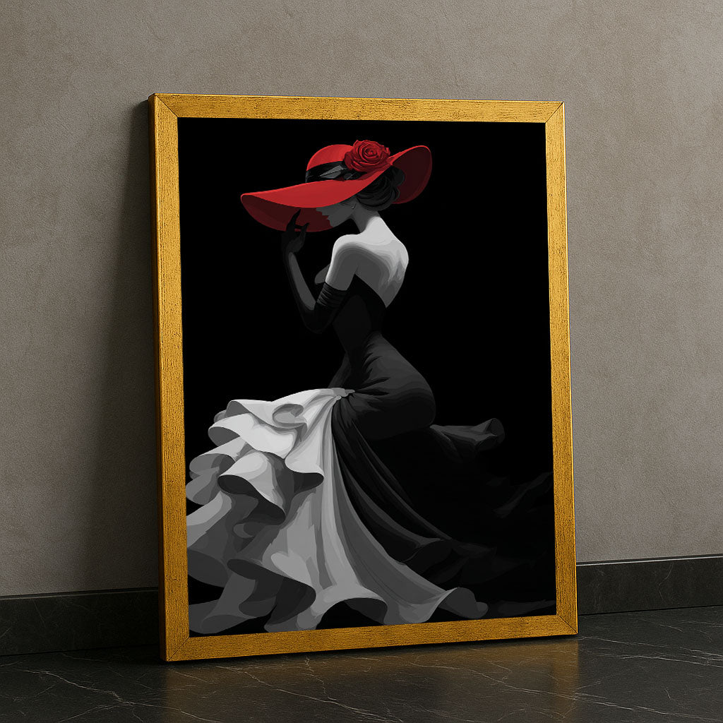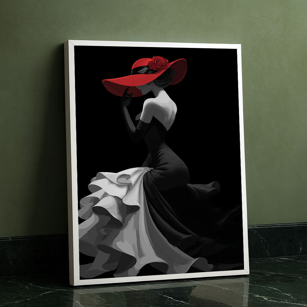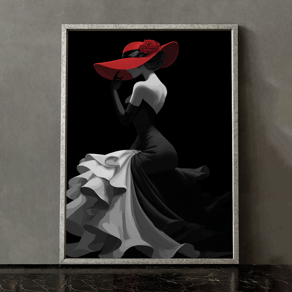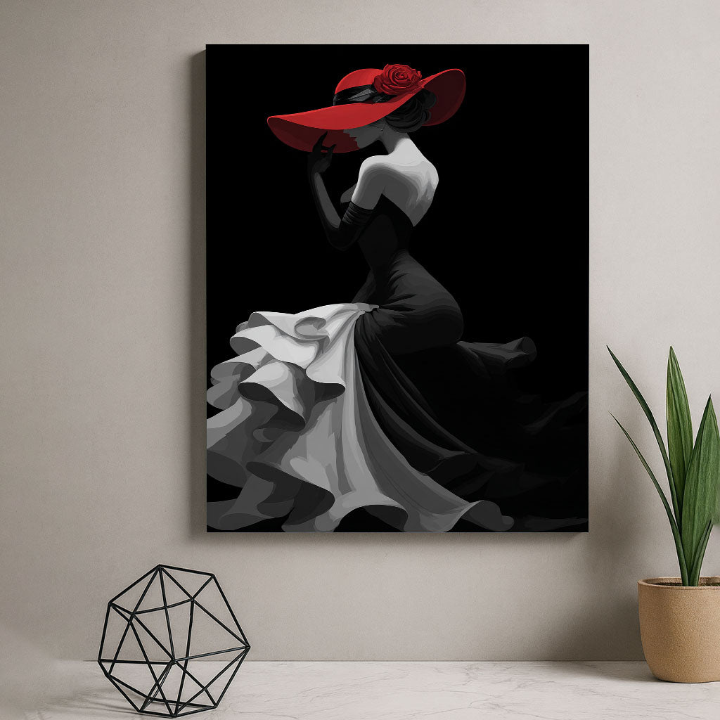 Elegant Woman In Red Hat And Black Dress Canvas Wall Art
