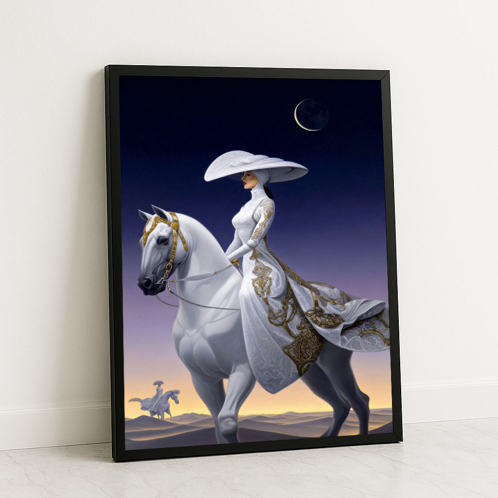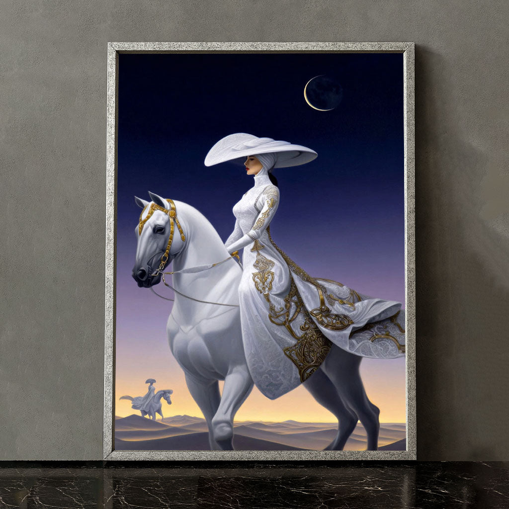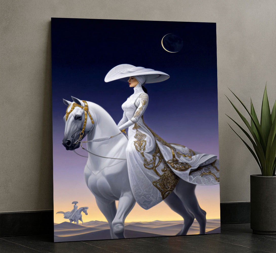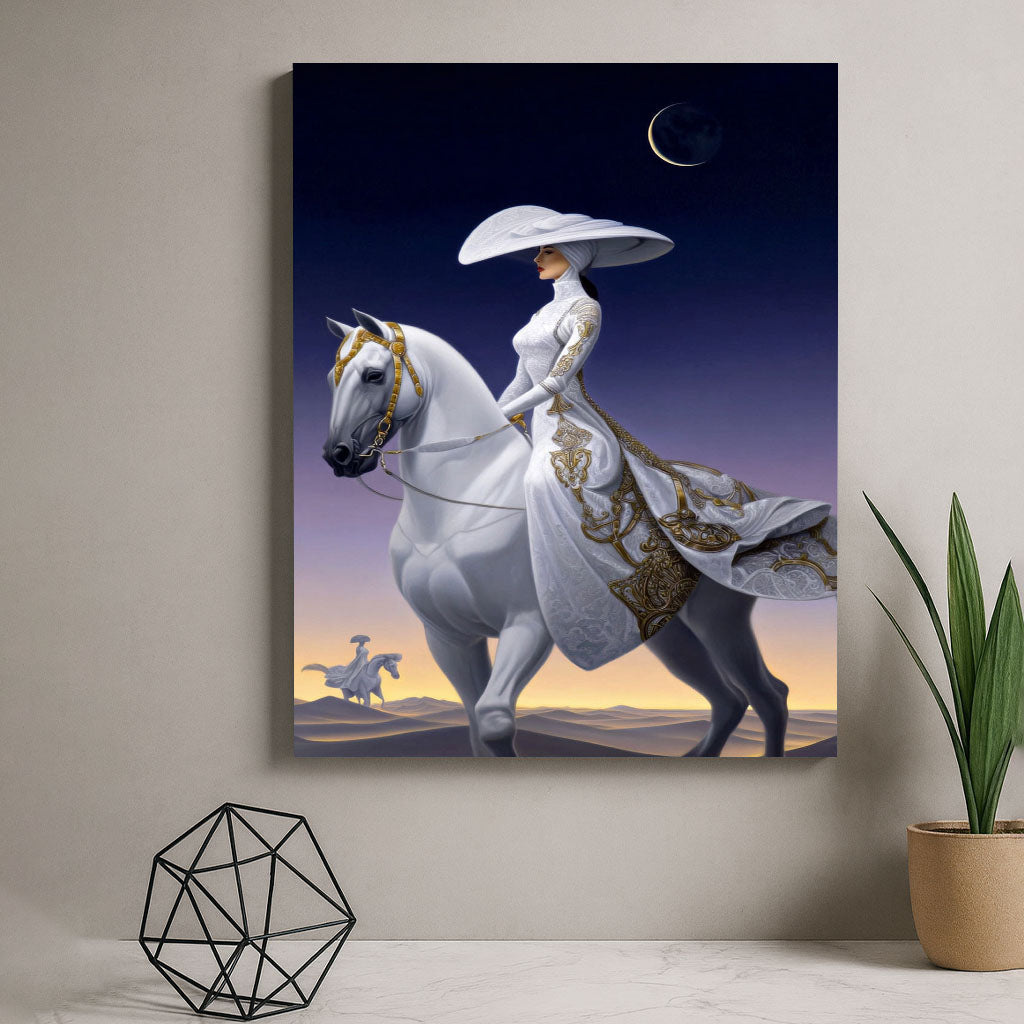 Elegant Woman In White Riding Horse Canvas Wall Art