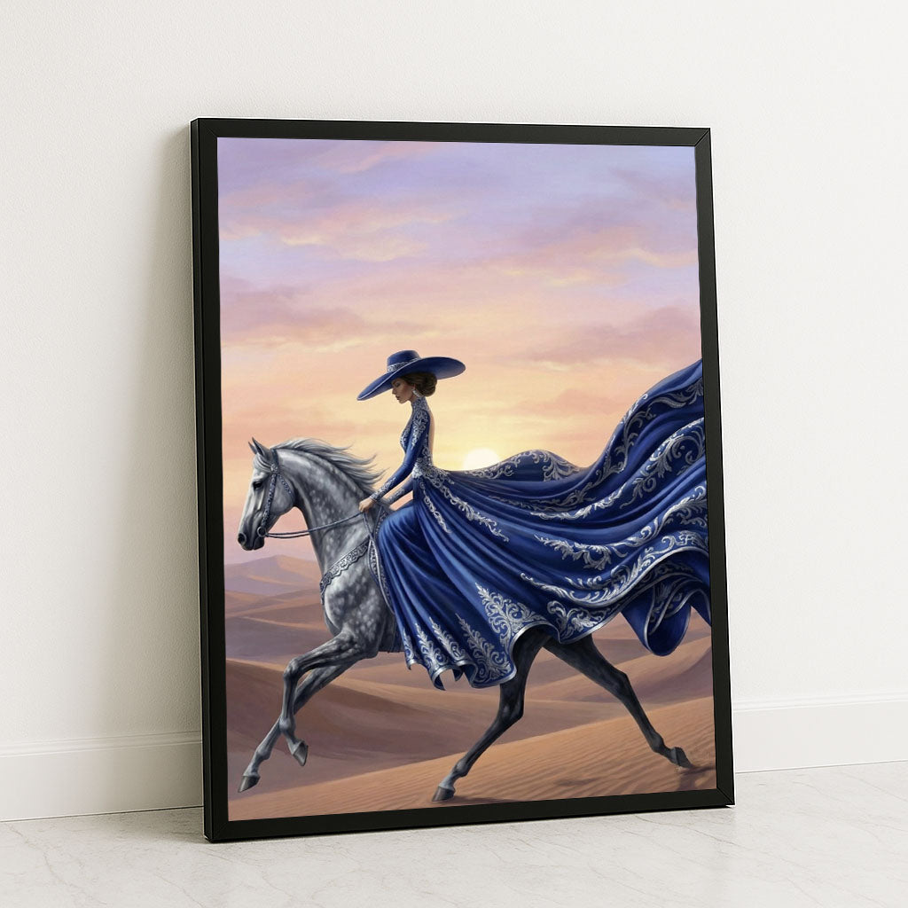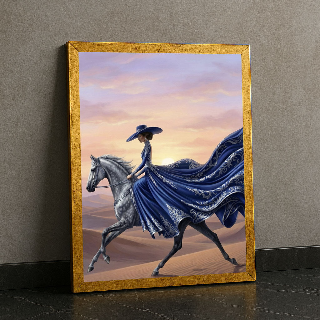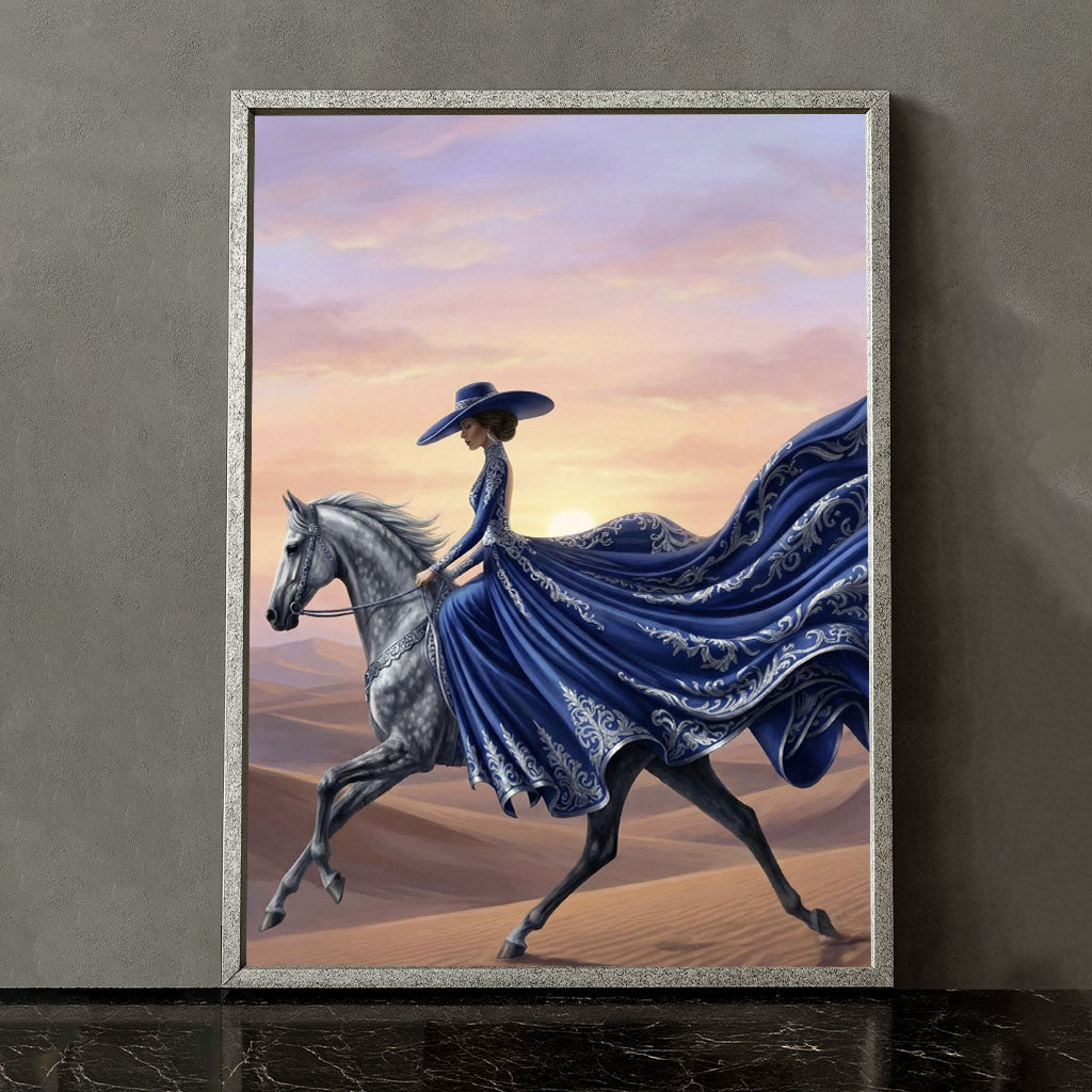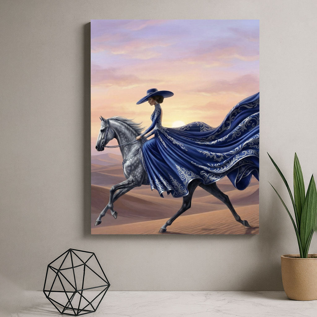 Elegant Woman On Horse In Flowing Blue Gown Canvas Wall Art