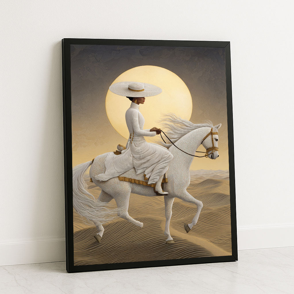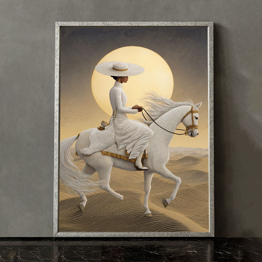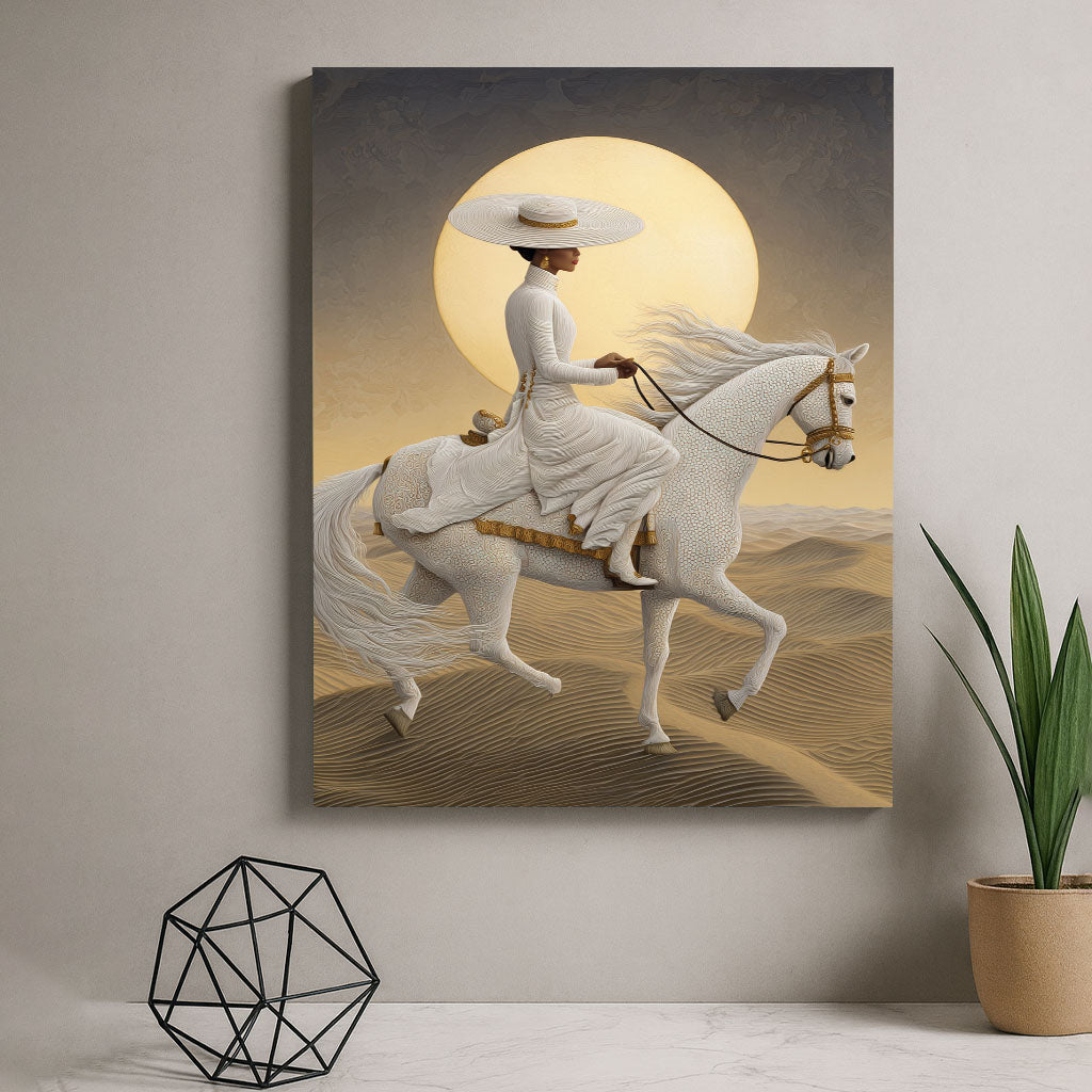 Elegant Woman On White Horse Under Moon Canvas Wall Art
