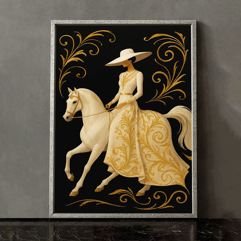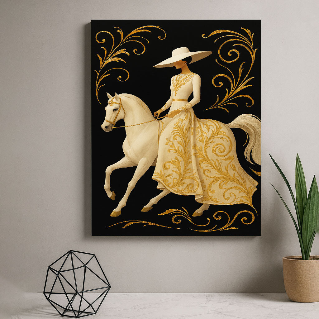 Elegant Woman On White Horse With Gold Swirls Canvas Wall Art