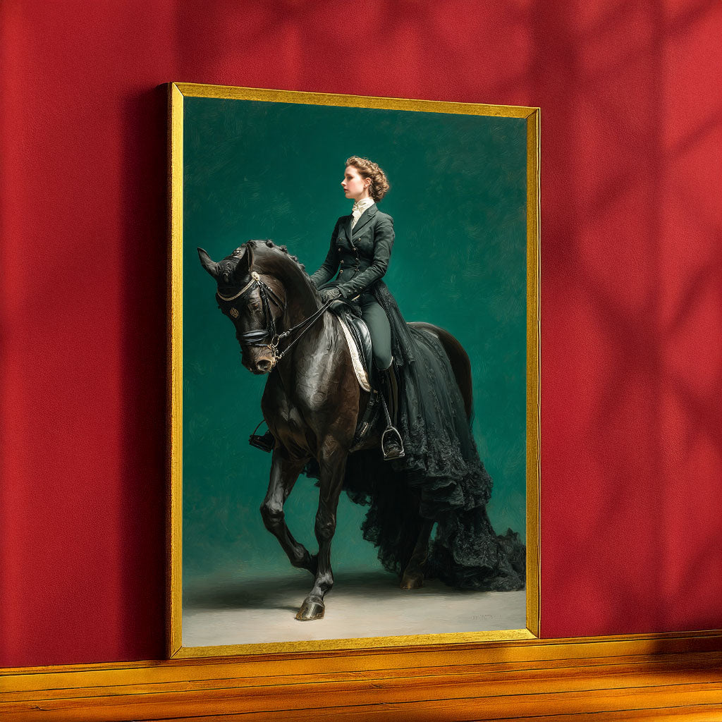 Elegant Woman Riding Black Horse Canvas Wall Art