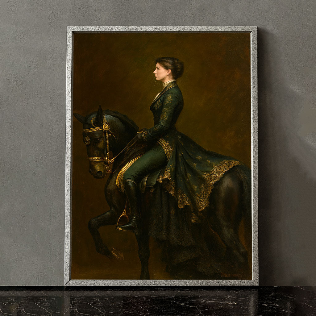 Elegant Woman Riding Black Horse Canvas Wall Art