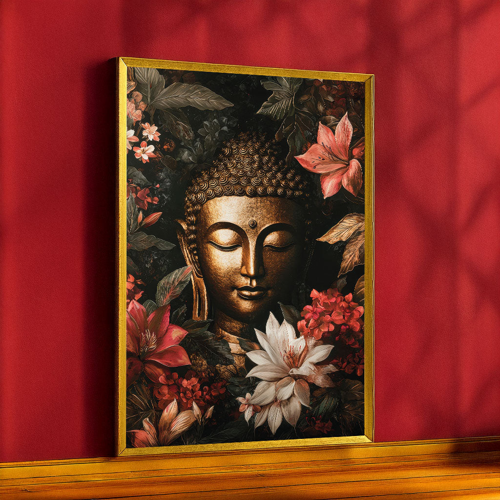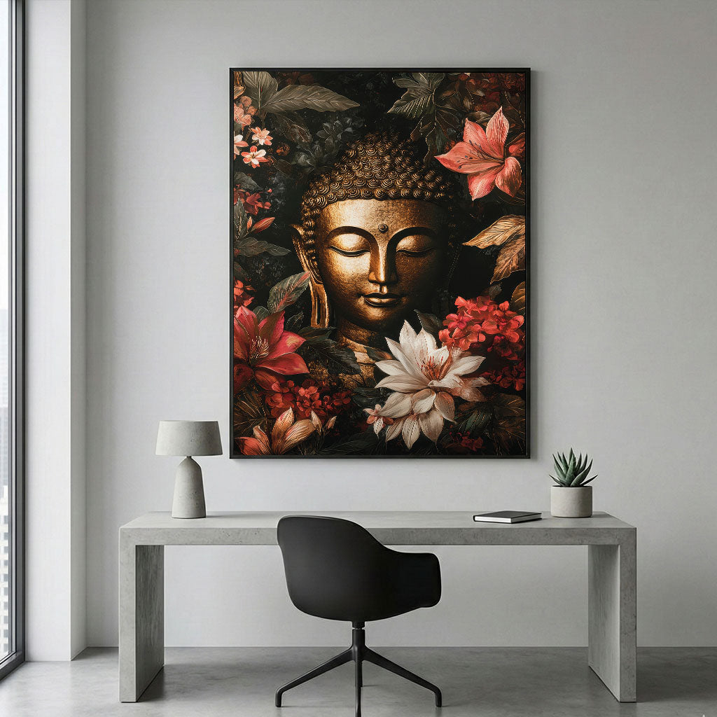 Enchanting Golden Buddha With Vibrant Flowers Canvas Wall Art