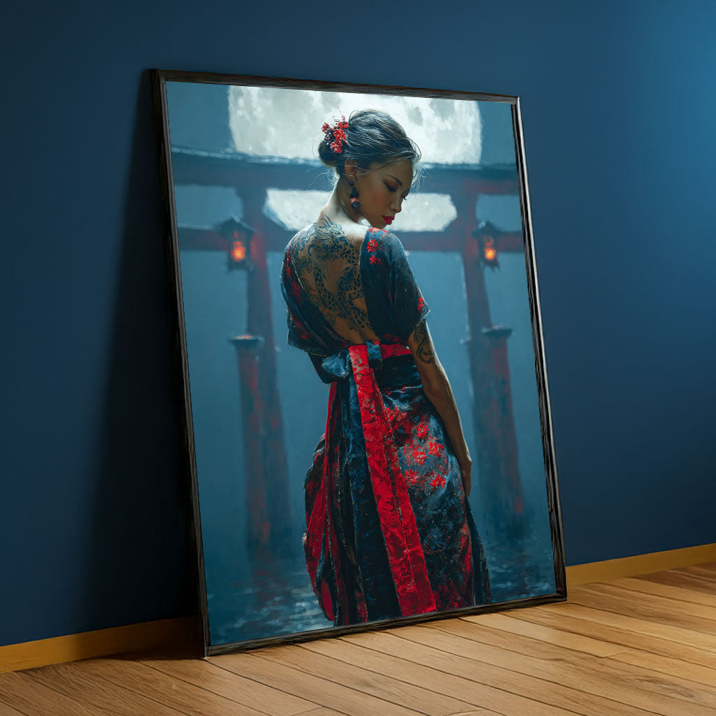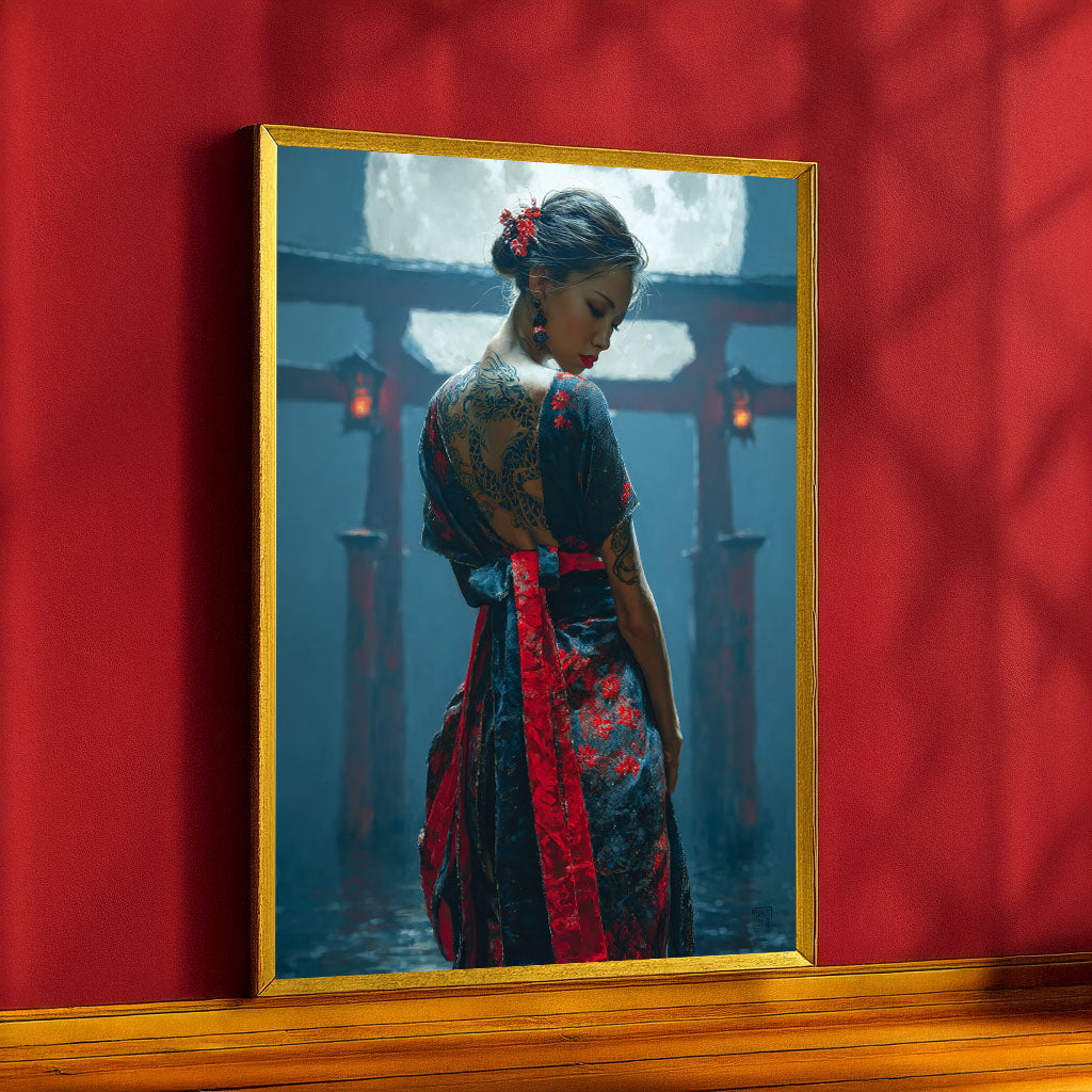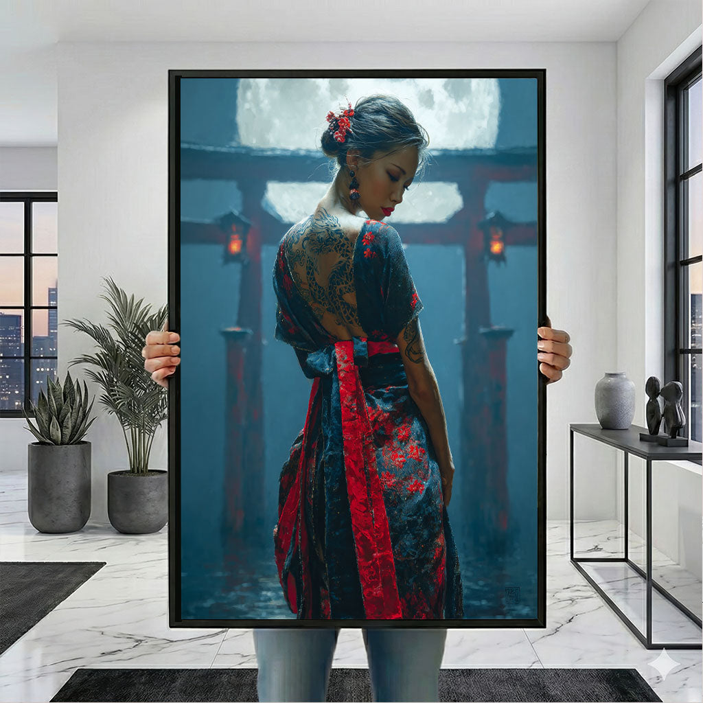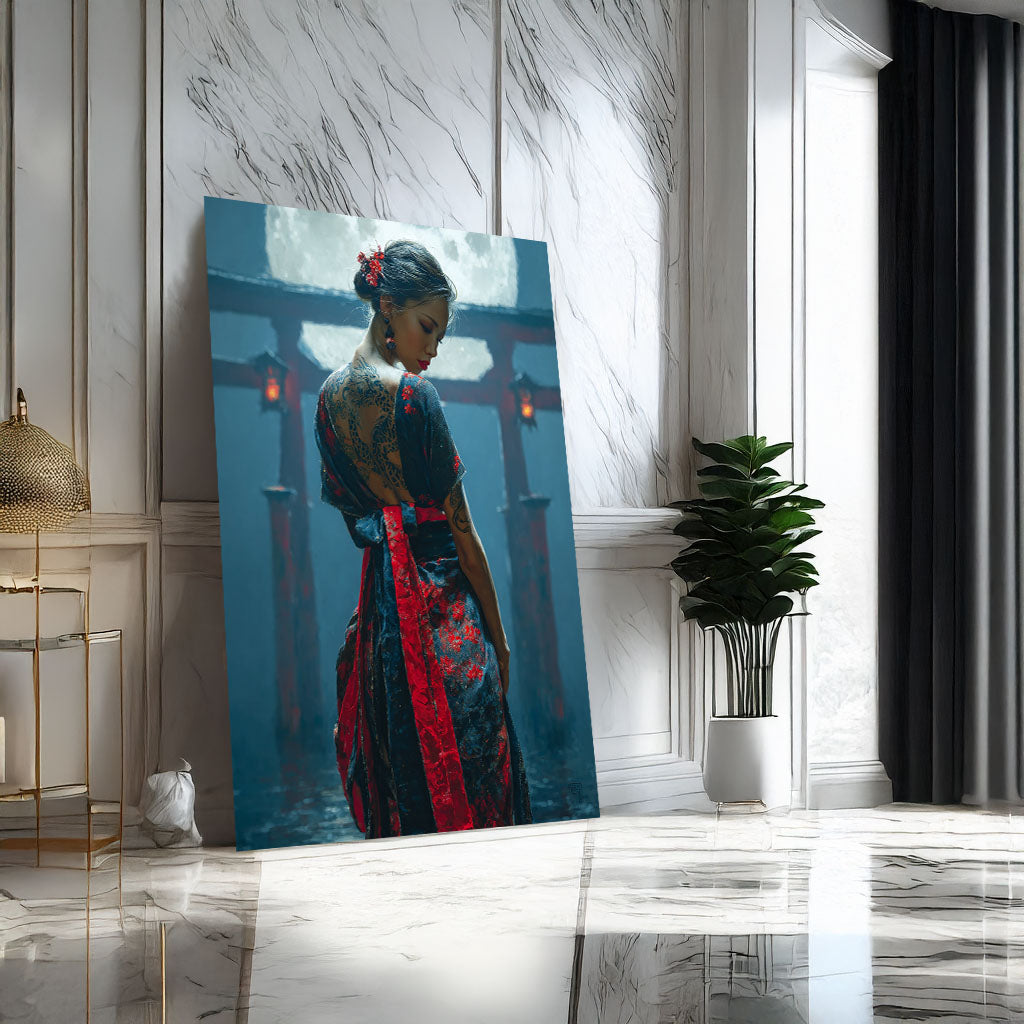 Enchanting Tattooed Woman In Red Kimono Canvas Wall Art