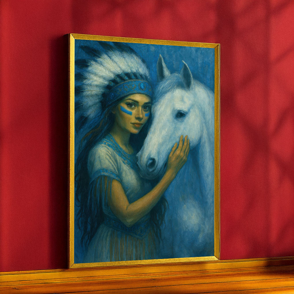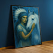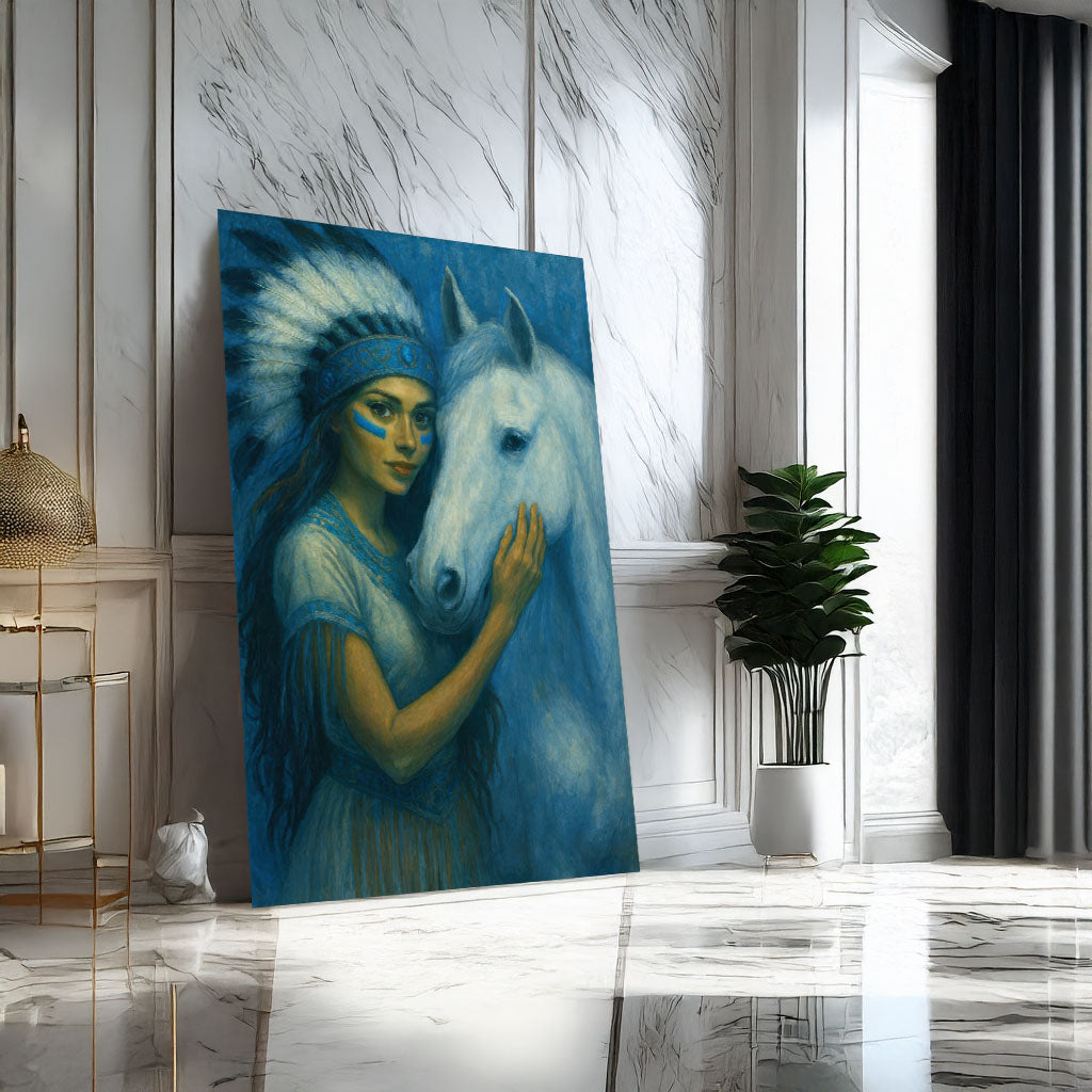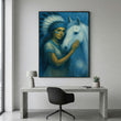 Enchanting Woman With White Horse In Blue Tones Canvas Wall Art