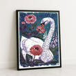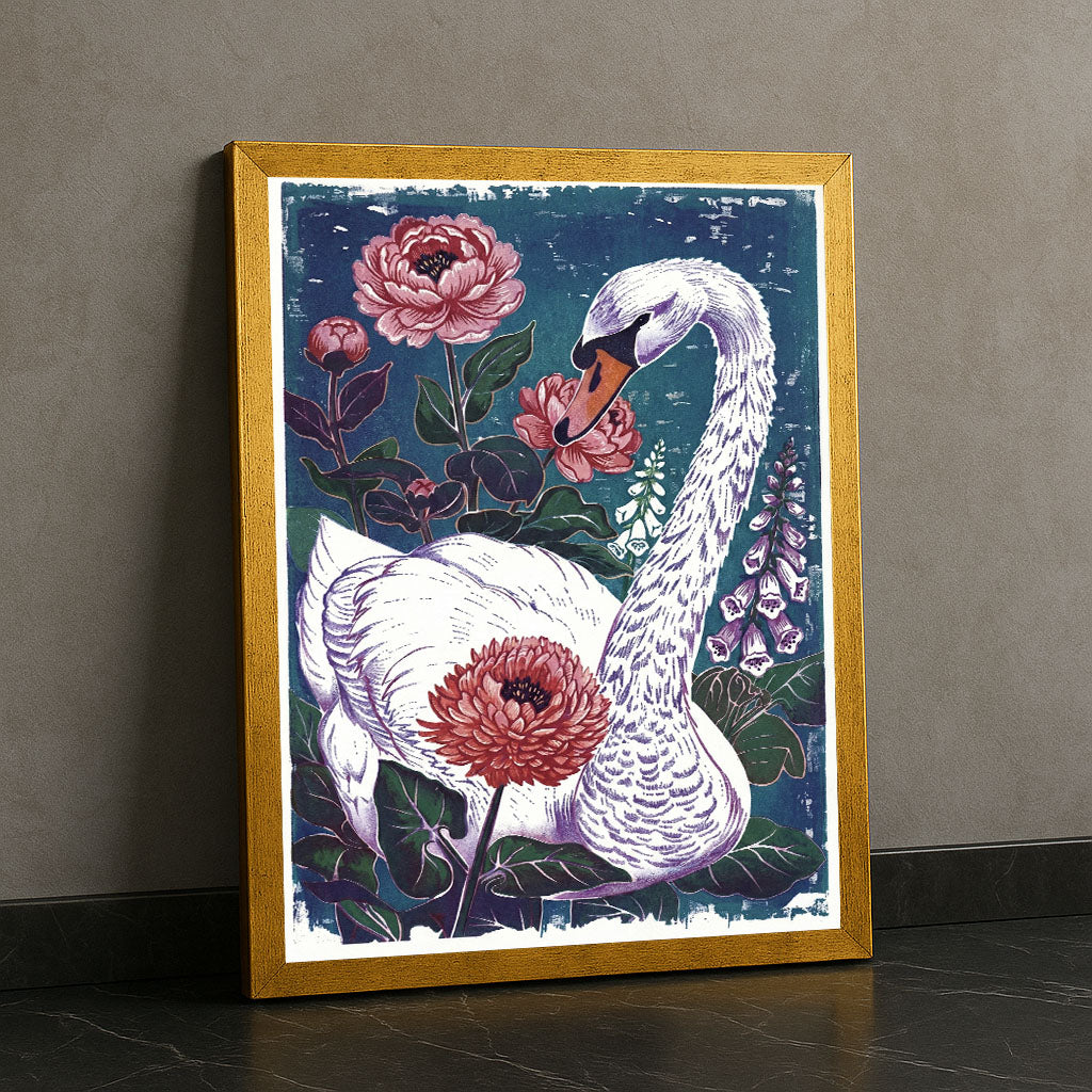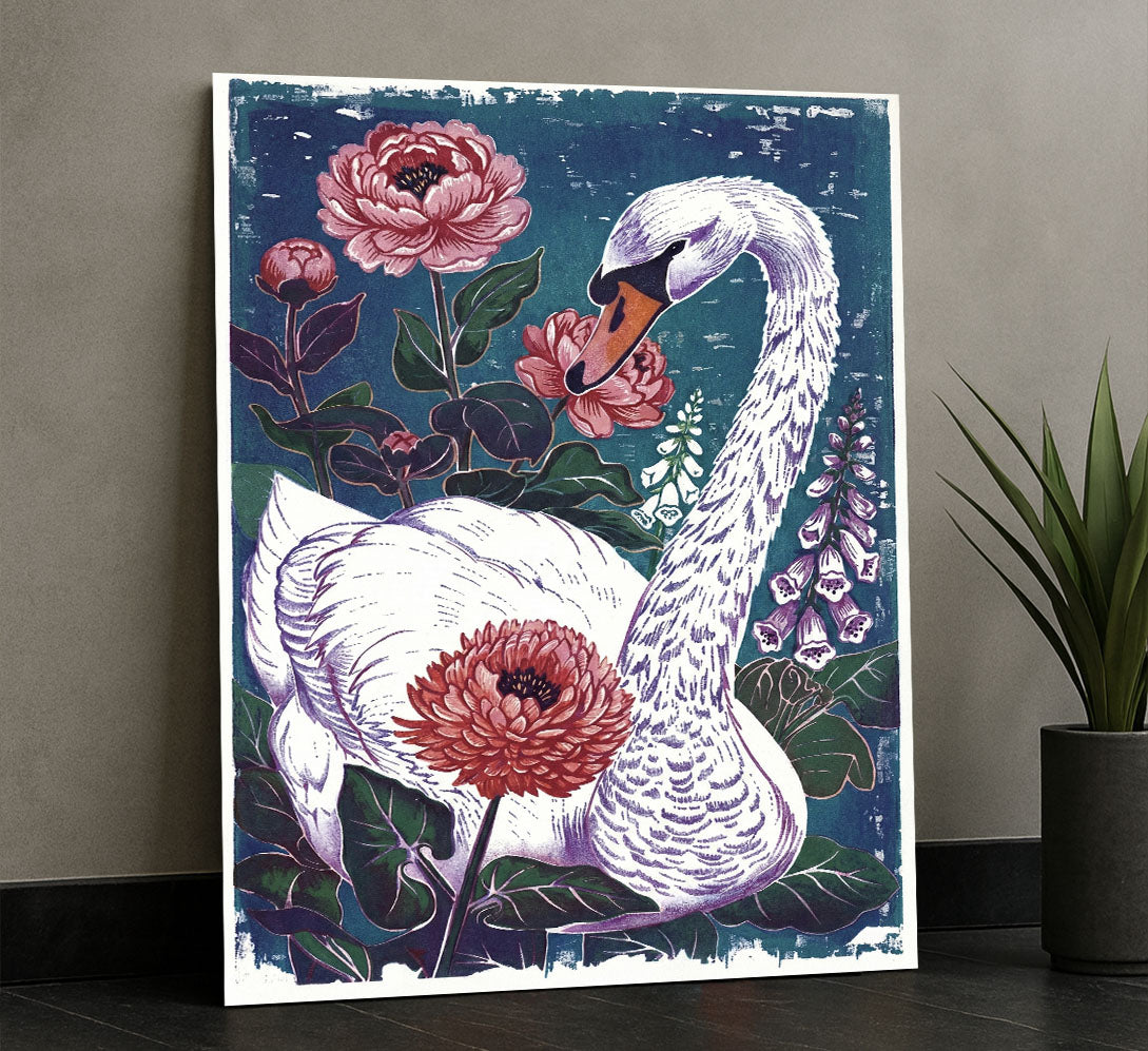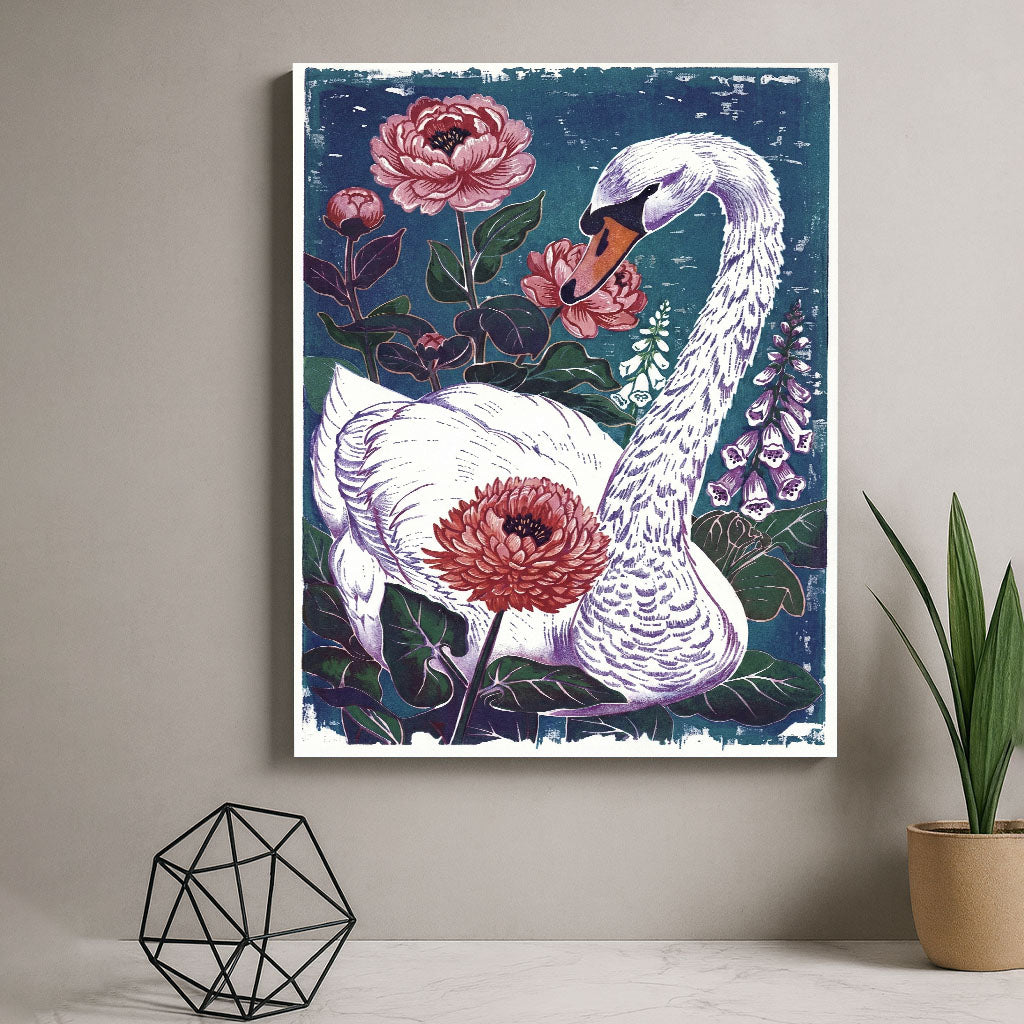 Graceful White Swan Among Vibrant Flowers Canvas Wall Art