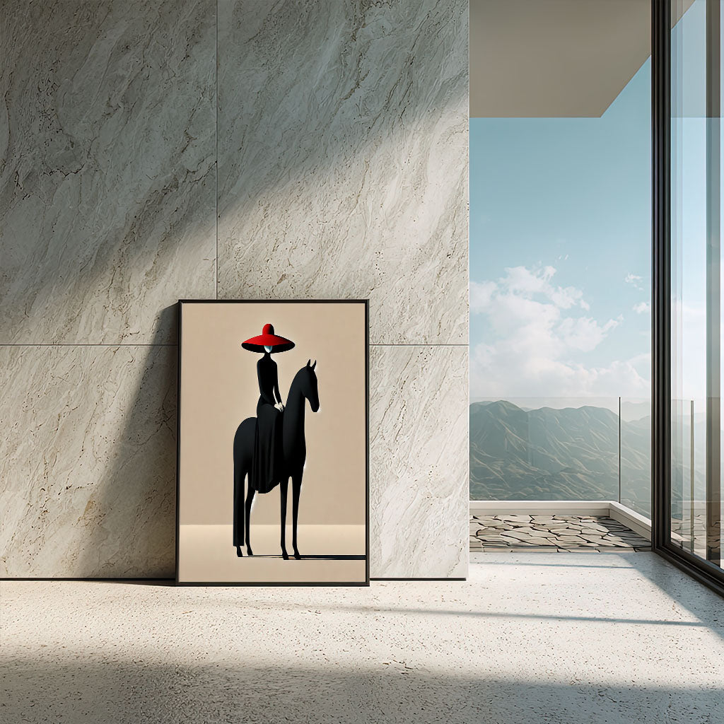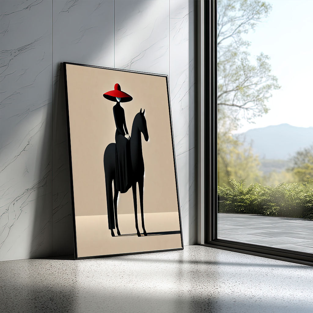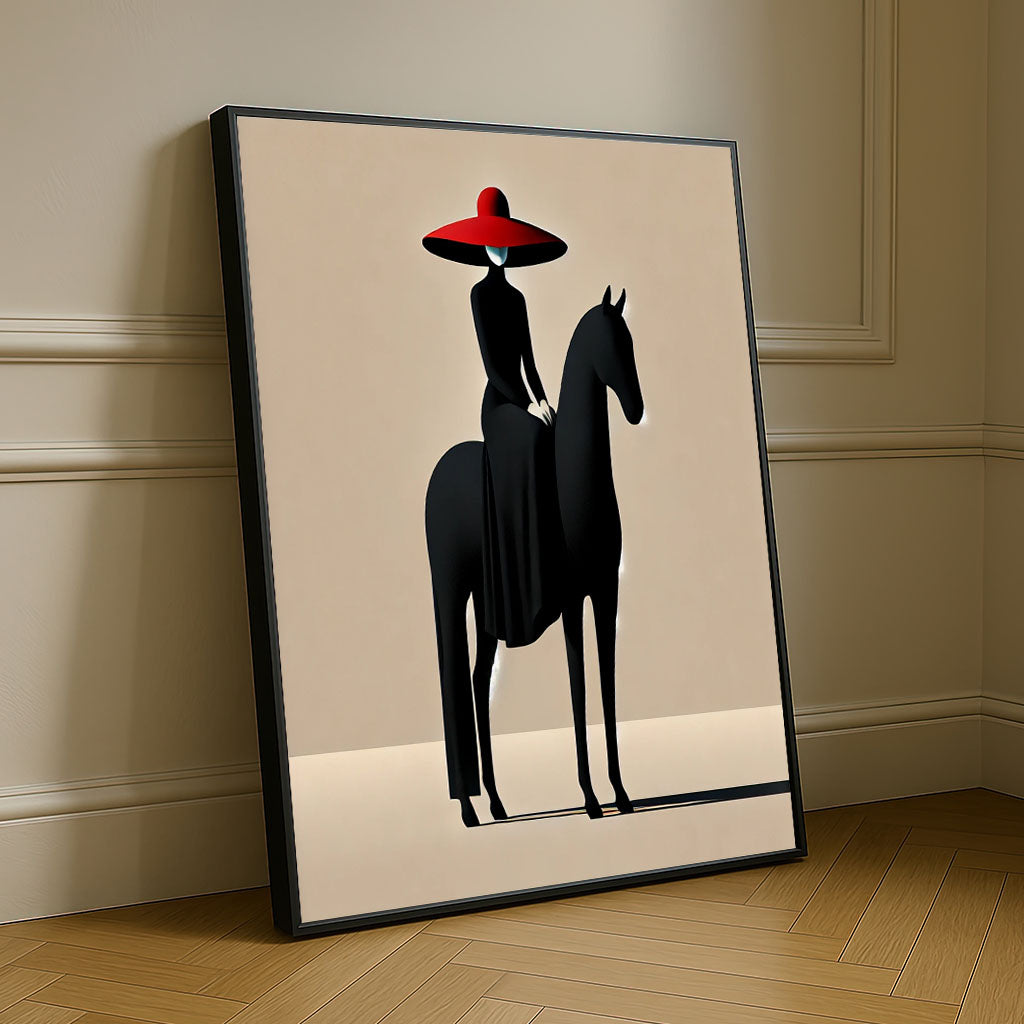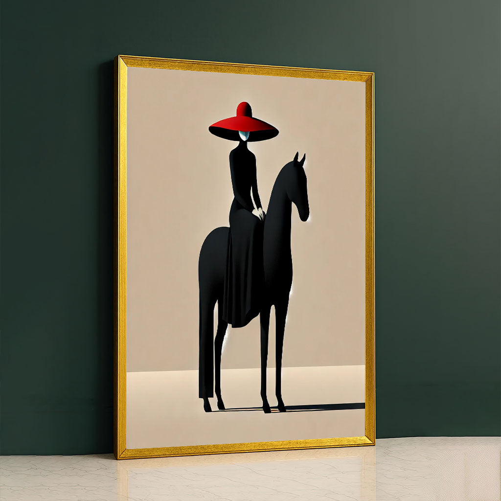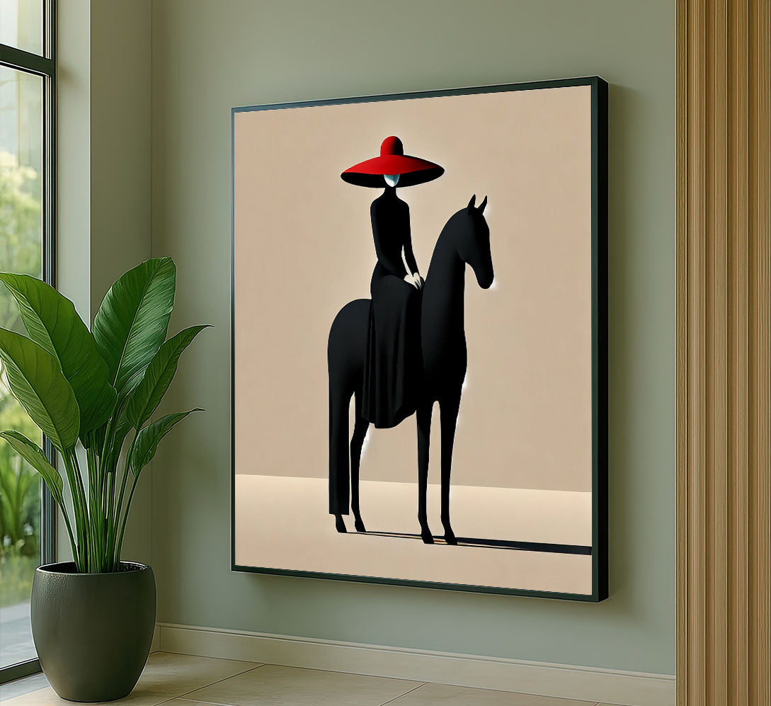 Graceful Woman In Red Hat On Black Horse Canvas Wall Art