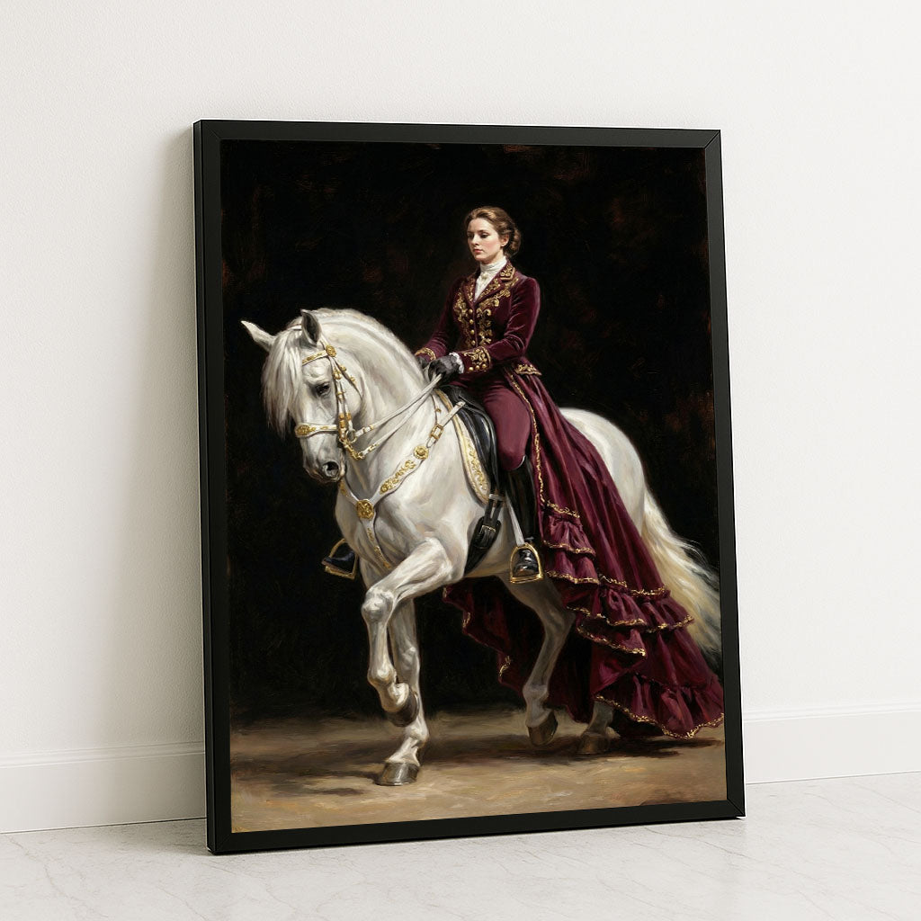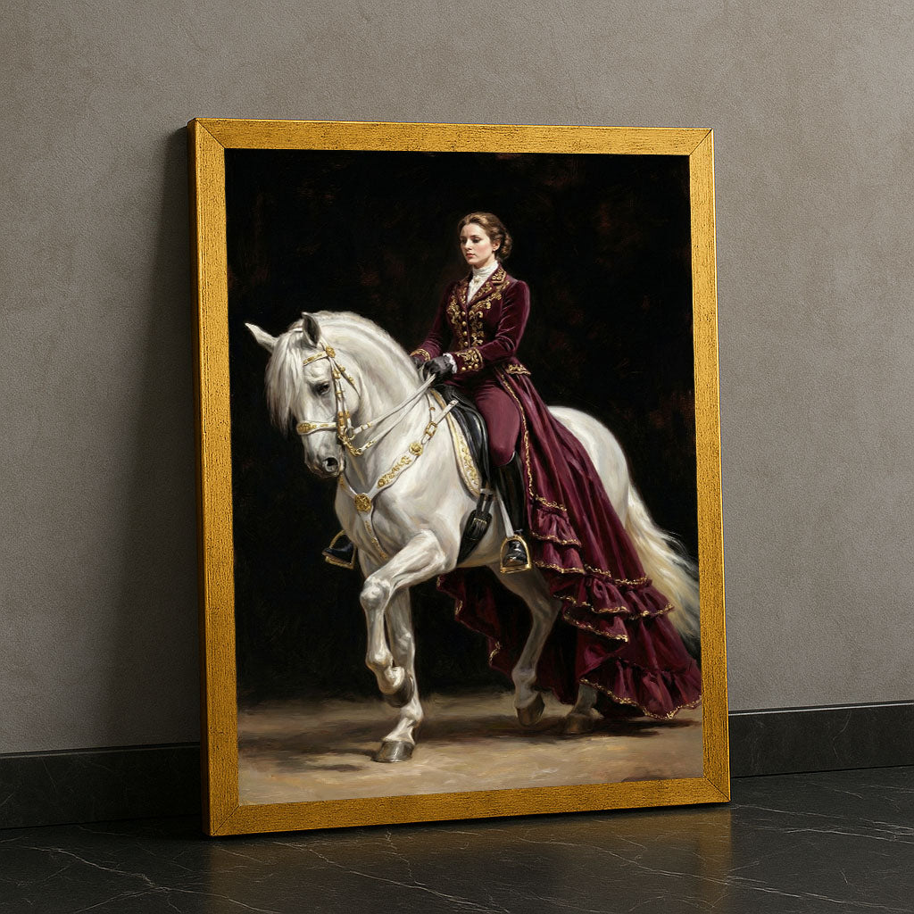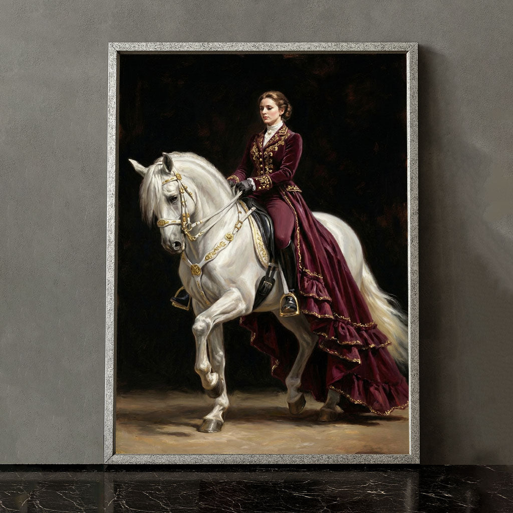 Majestic Woman In Burgundy On White Horse Canvas Wall Art