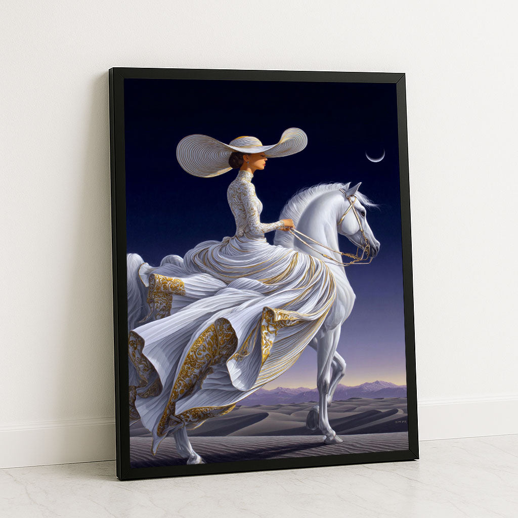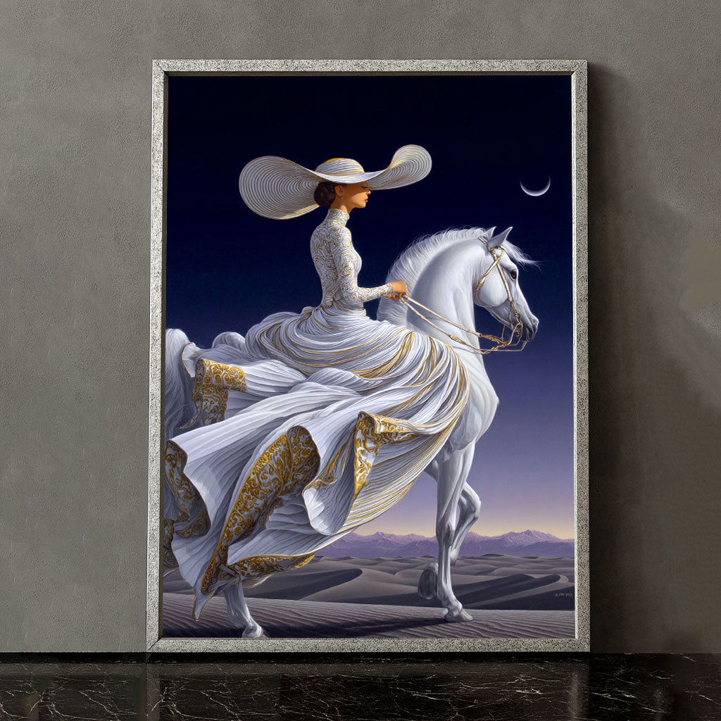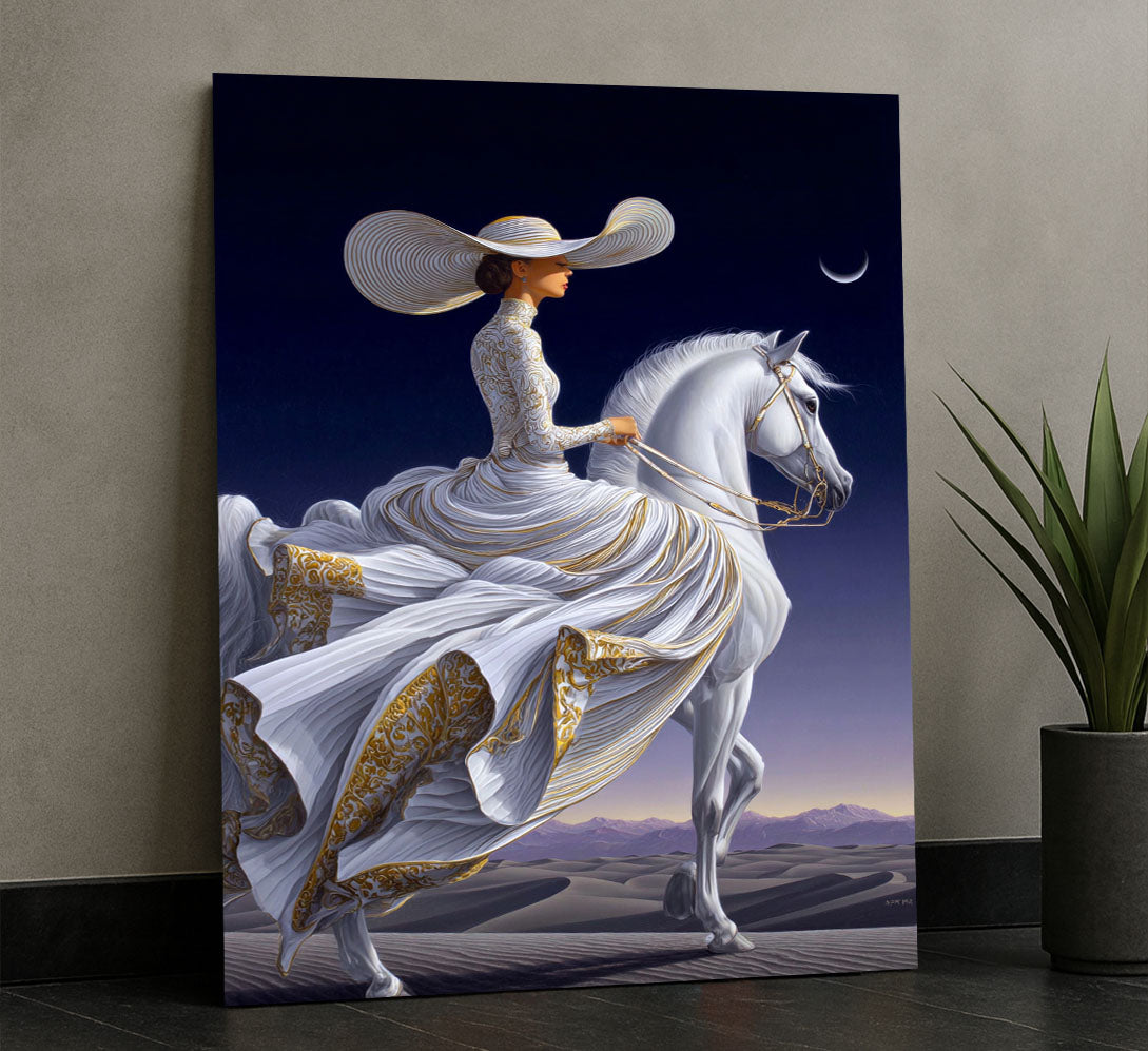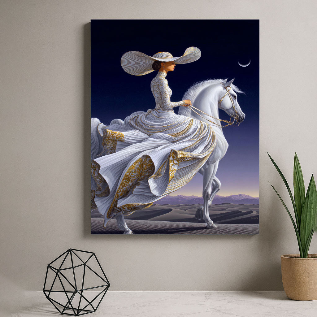 Majestic Woman In Elegant Gown On White Horse Canvas Wall Art