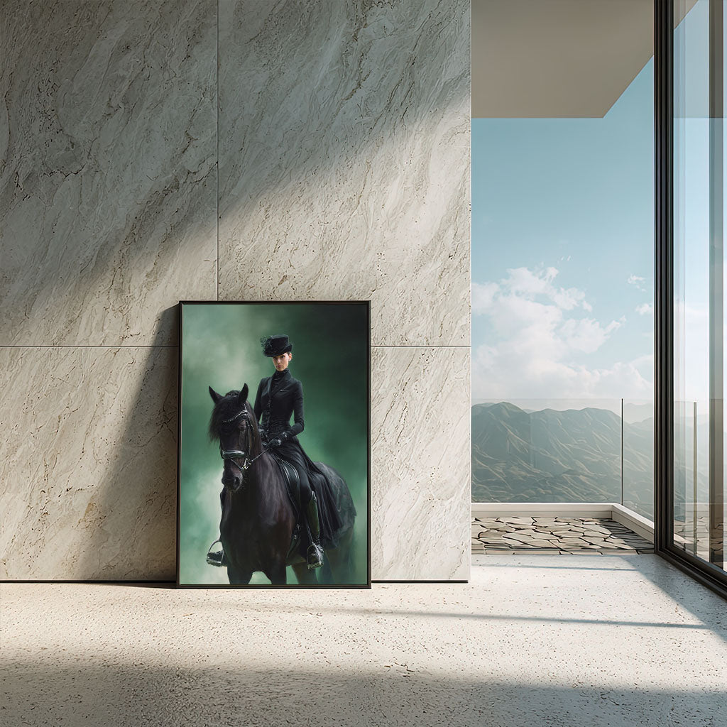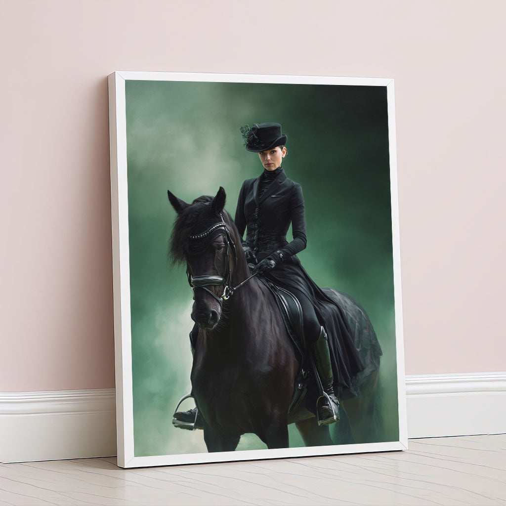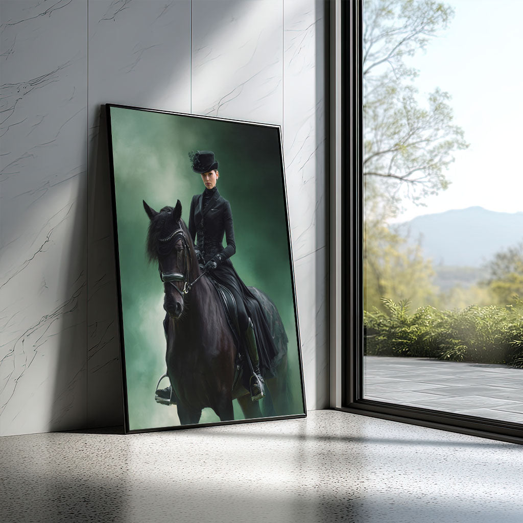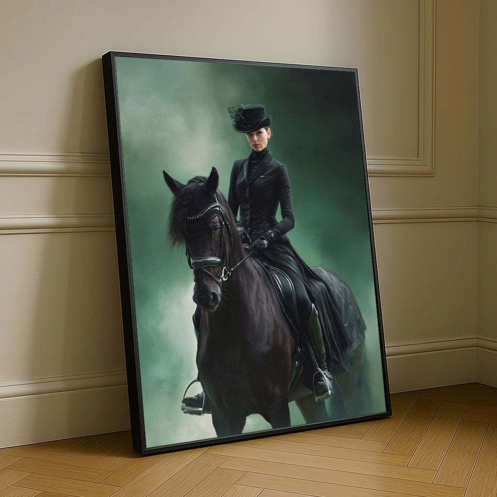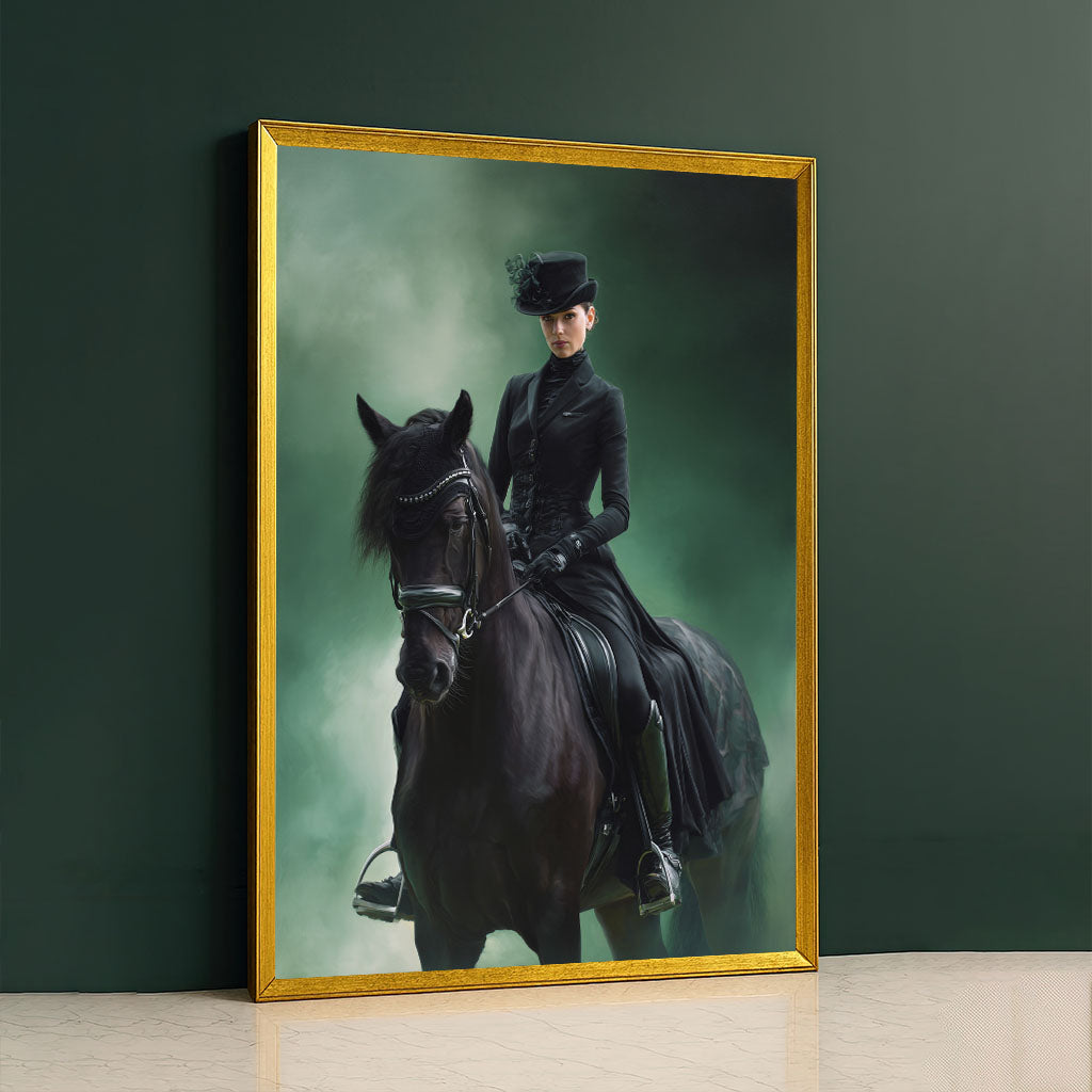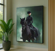 Majestic Woman In Equestrian Attire On Black Horse Canvas Wall Art