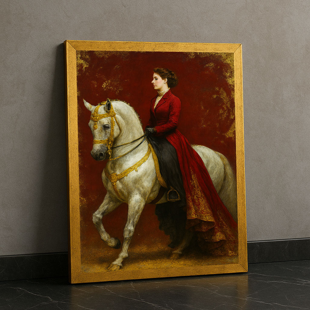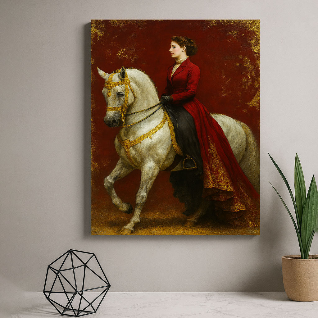 Majestic Woman In Red Riding White Horse Canvas Wall Art