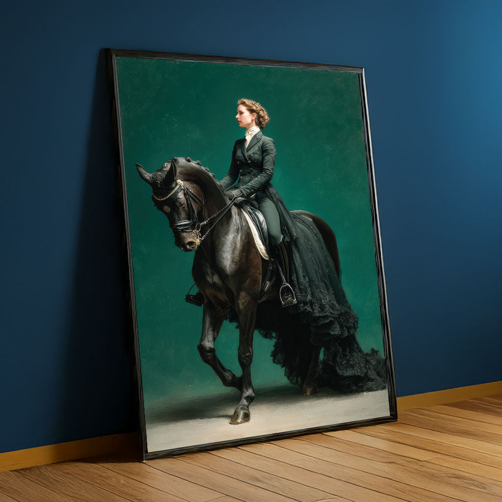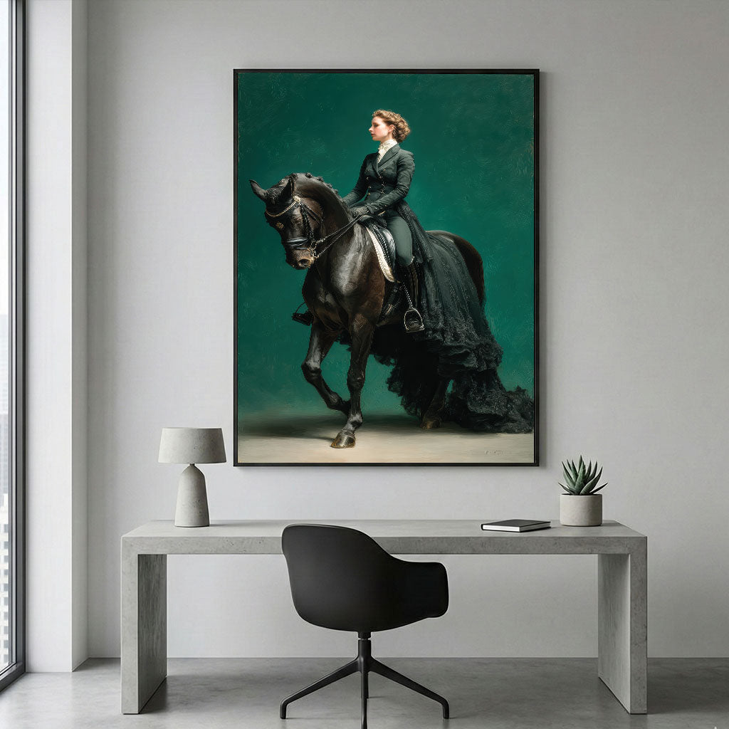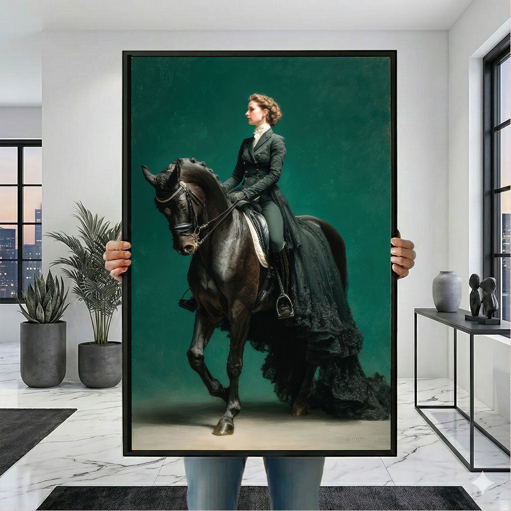 Majestic Woman Riding Black Horse Canvas Wall Art