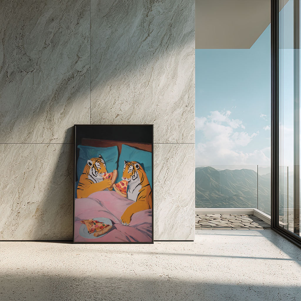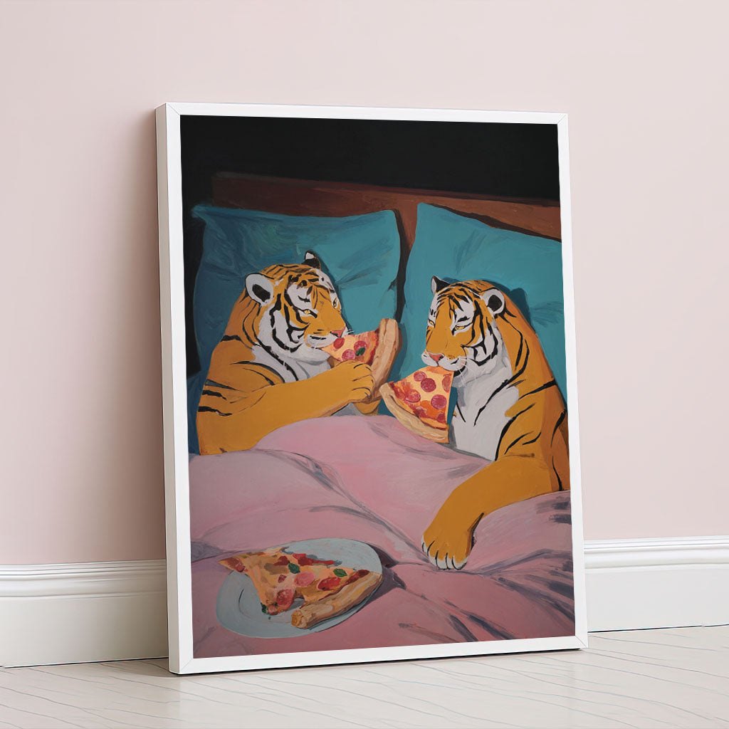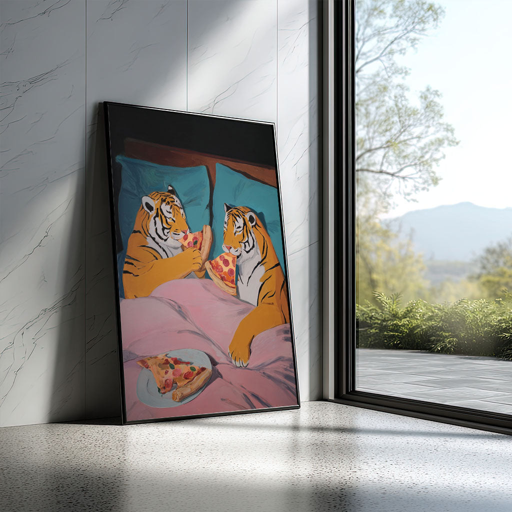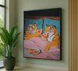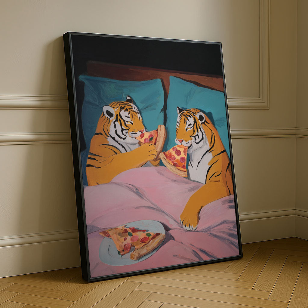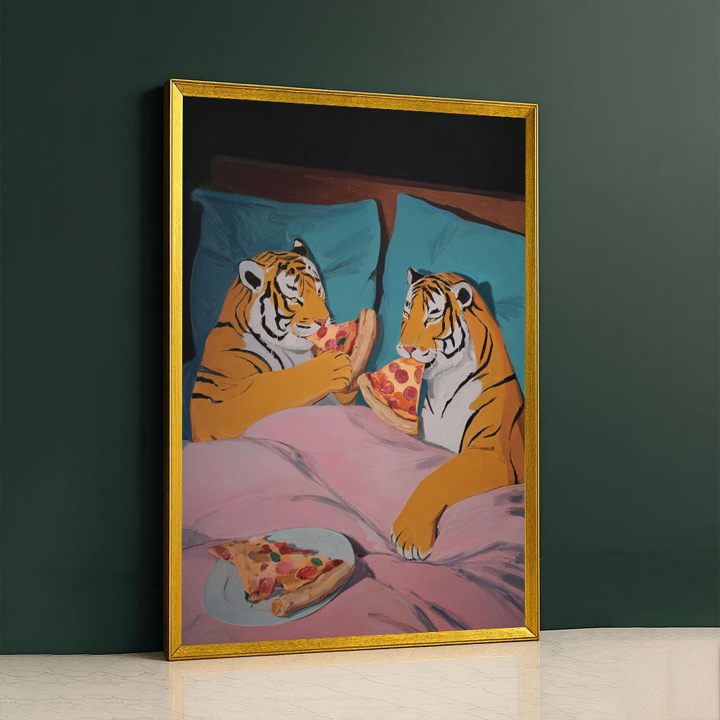 Playful Tigers Sharing Pizza In Bed Canvas Wall Art