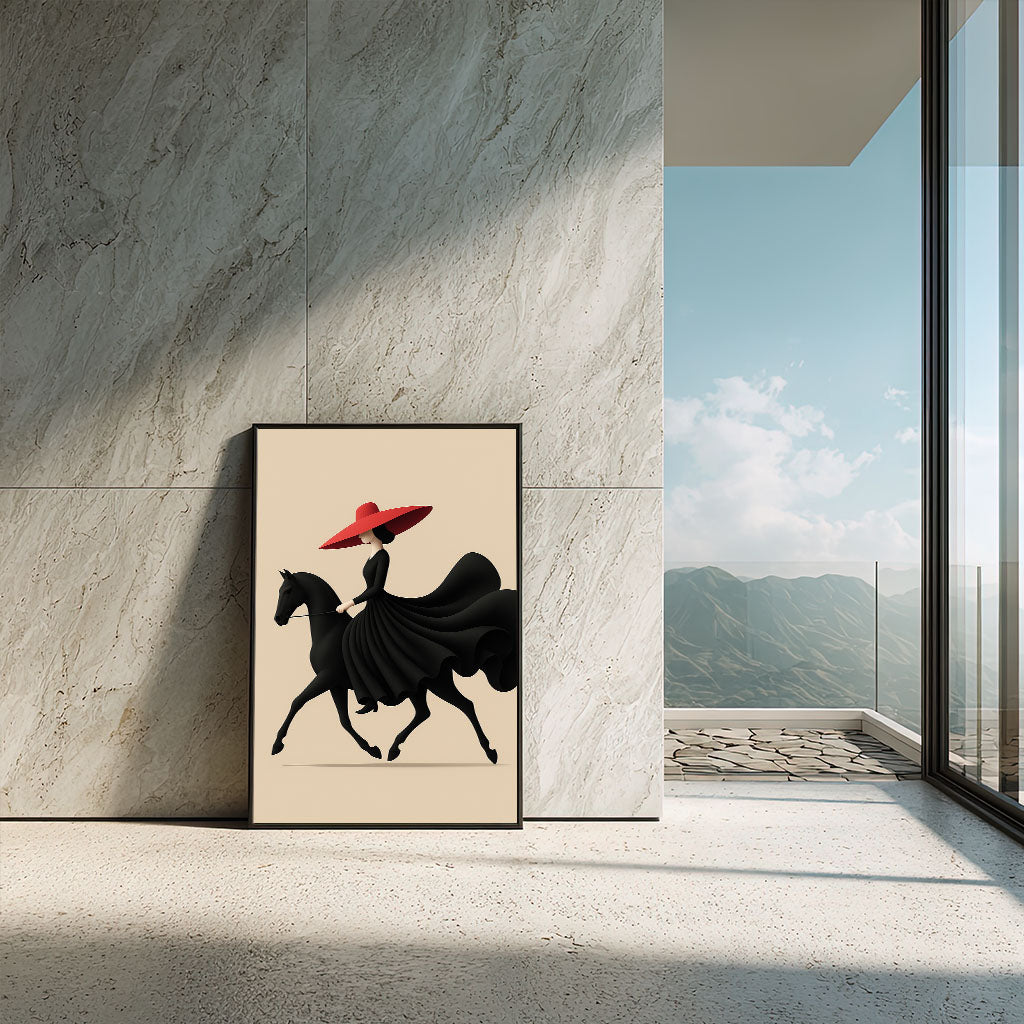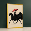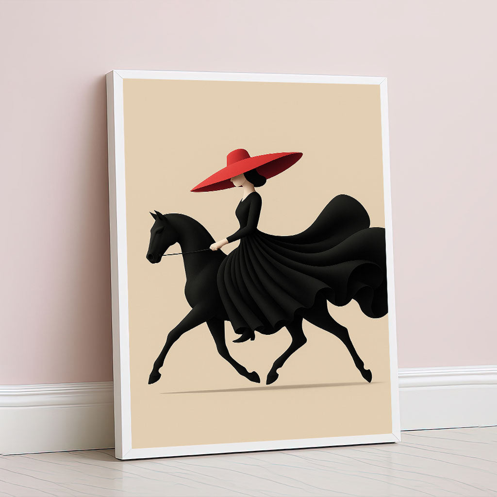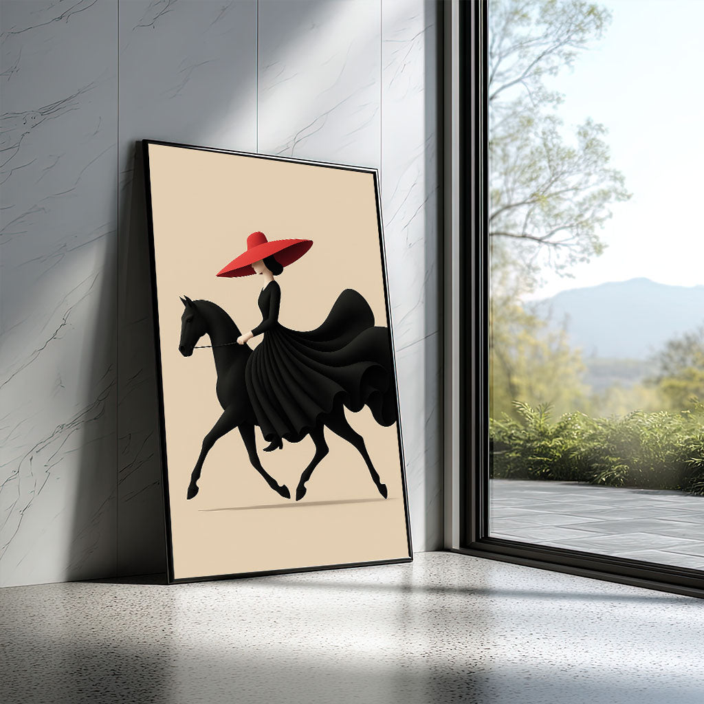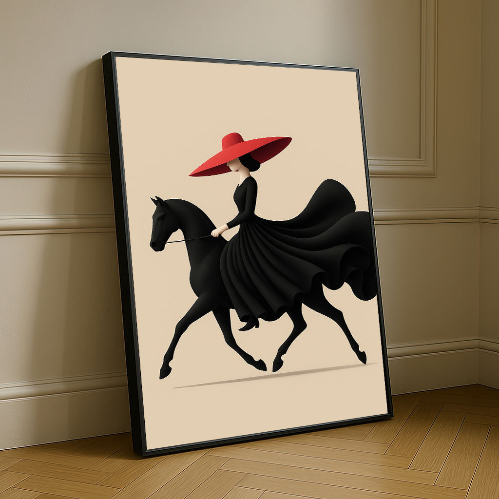 Striking Woman In Black Dress On Horse Canvas Wall Art
