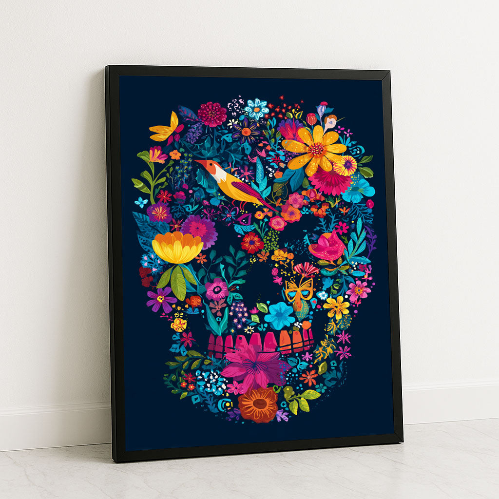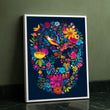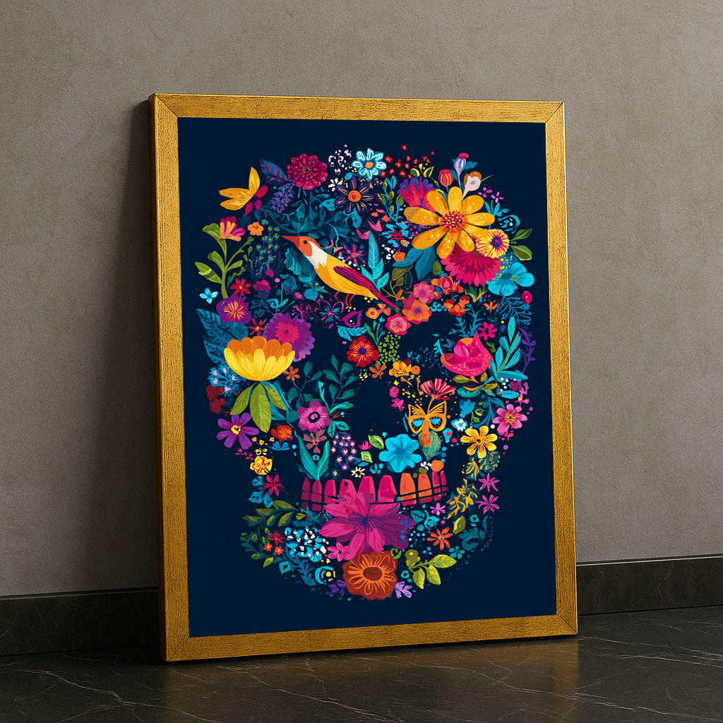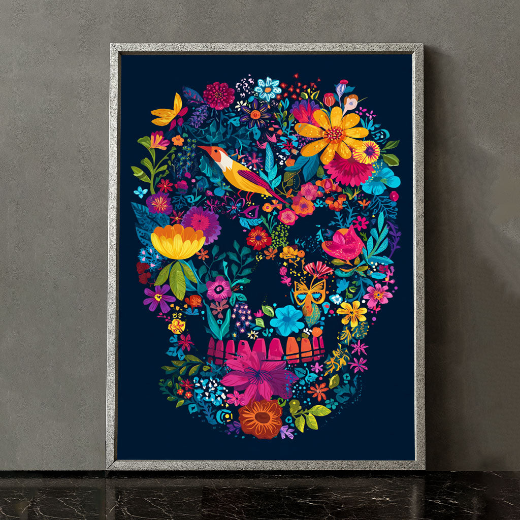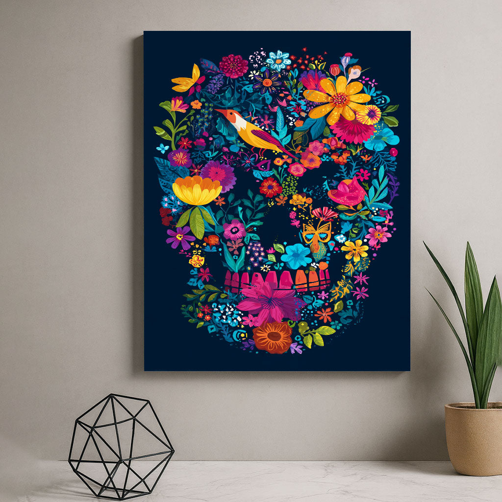 Vibrant Floral Skull With Bird And Butterflies Canvas Wall Art